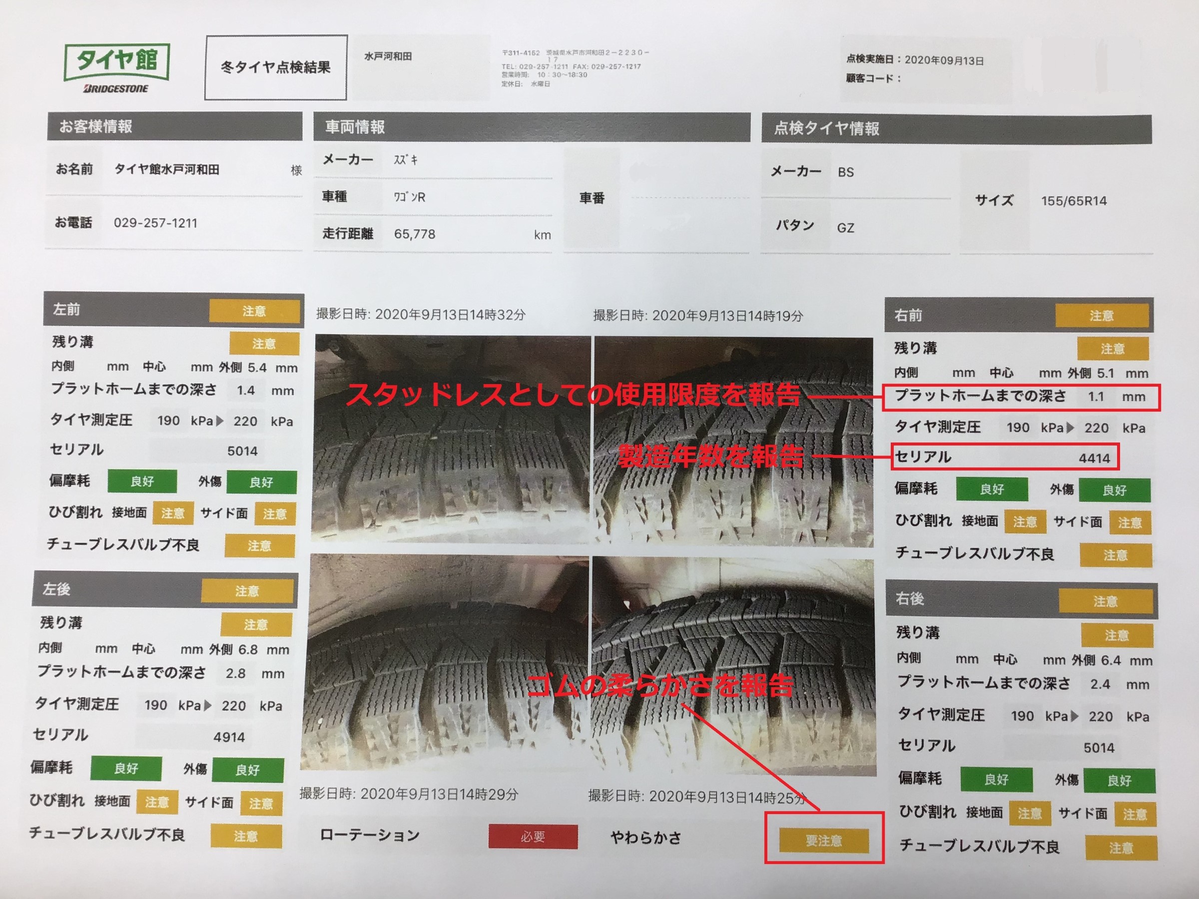 冬用タイヤとしては使用できなくなります。当店では全体の残溝とプラットホームまでの残溝を点検します!