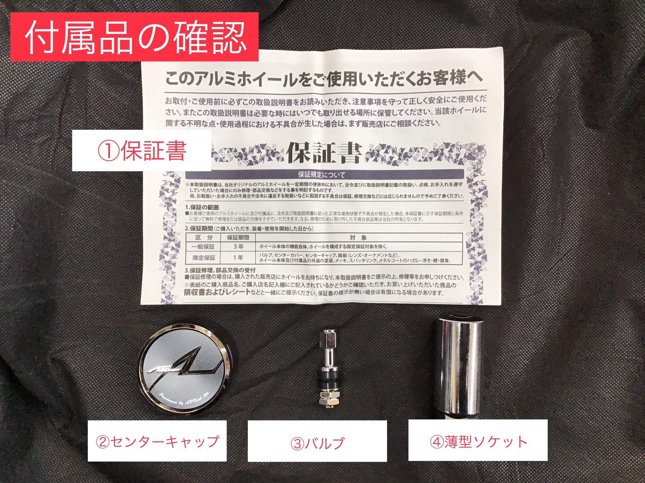 ①保証書 ②センターキャップ ③バルブ ④薄型ソケット です。