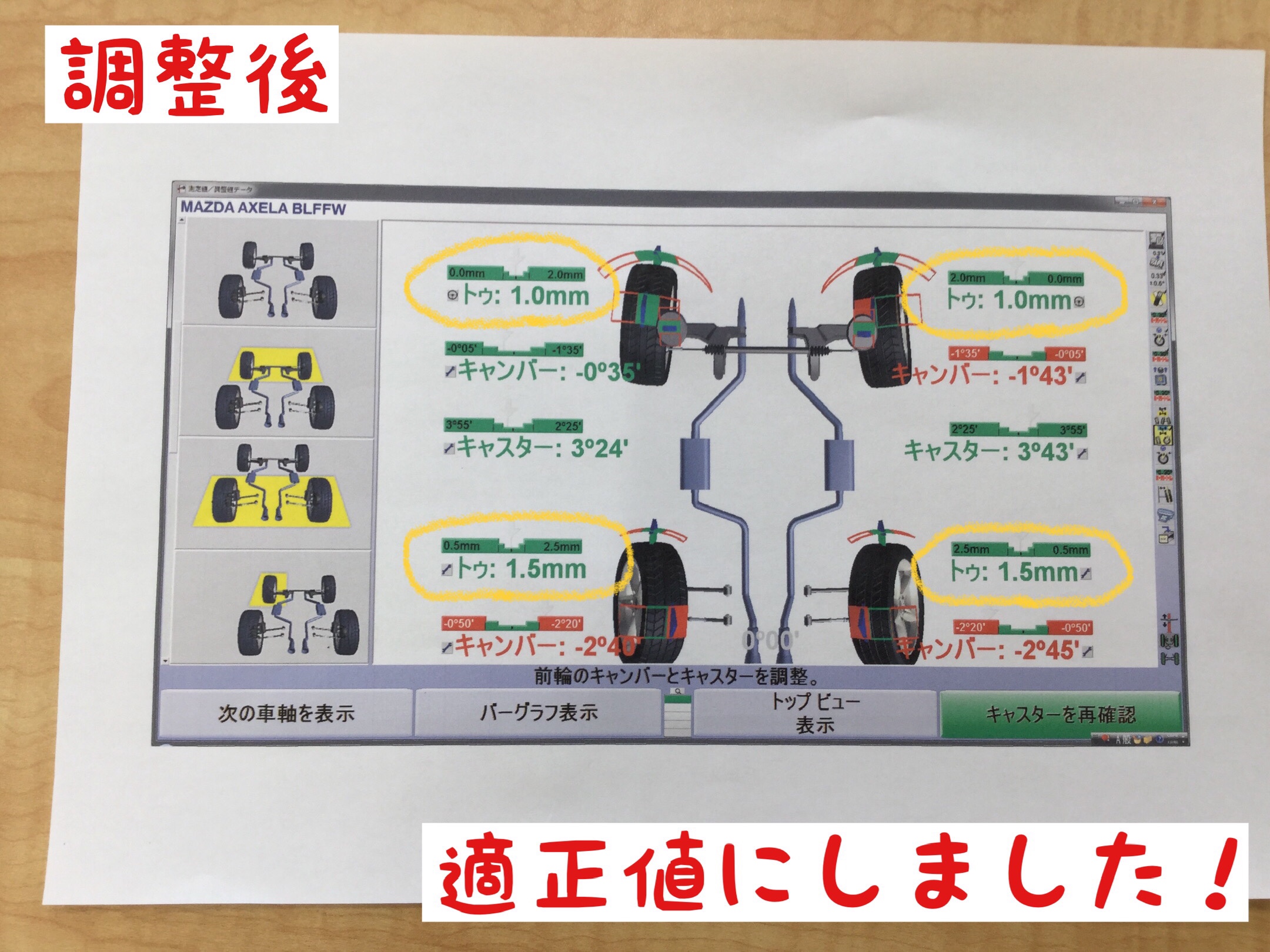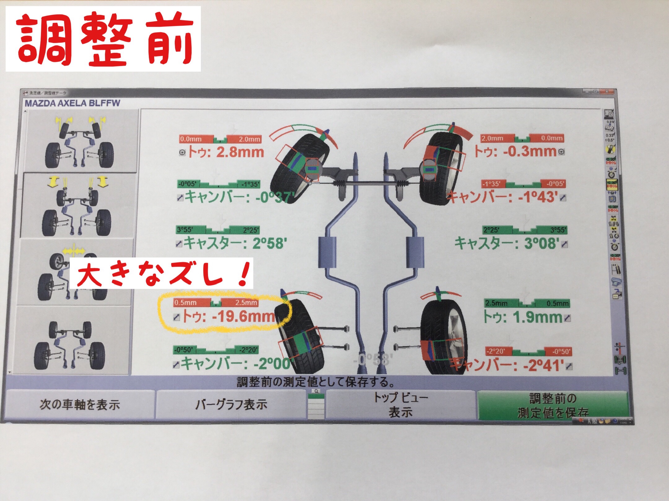 こちらが調整前の測定値になります。赤文字が基準値を外れた部分なのですが、トゥと呼ばれるタイヤの左右の角度が前後、特に左後が大きくズレてしまっています。