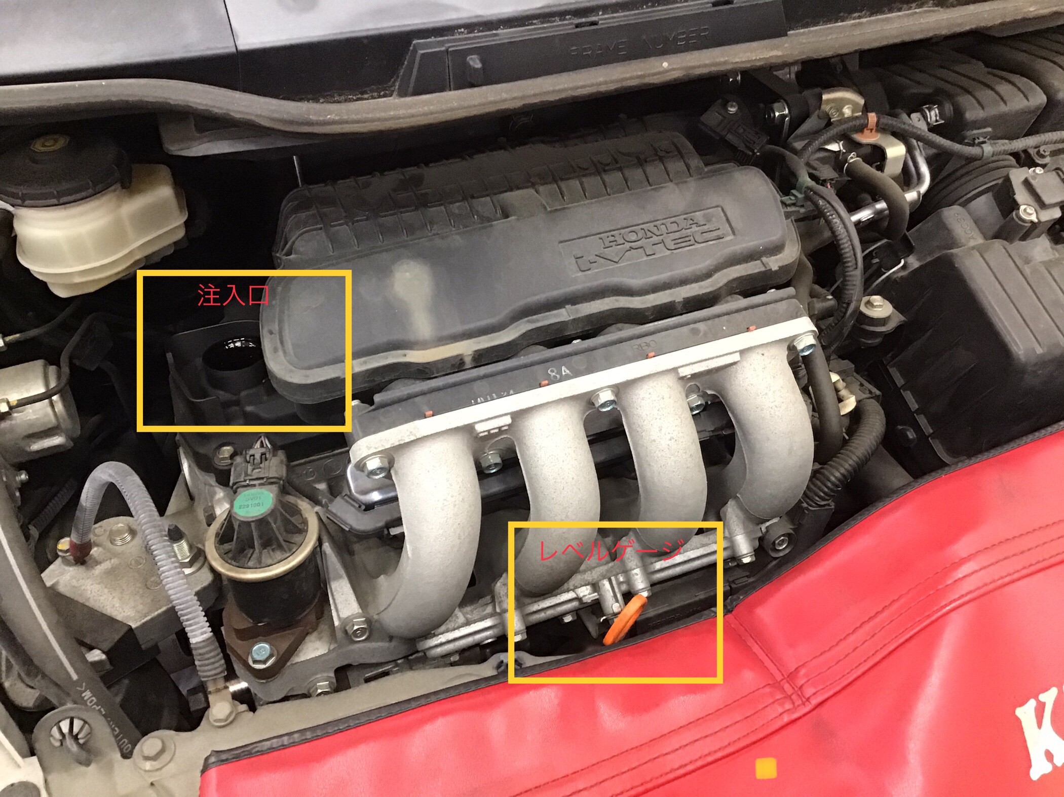 注入口は新油の注ぎ口、レベルゲージは量や汚れのチェックに使用します。