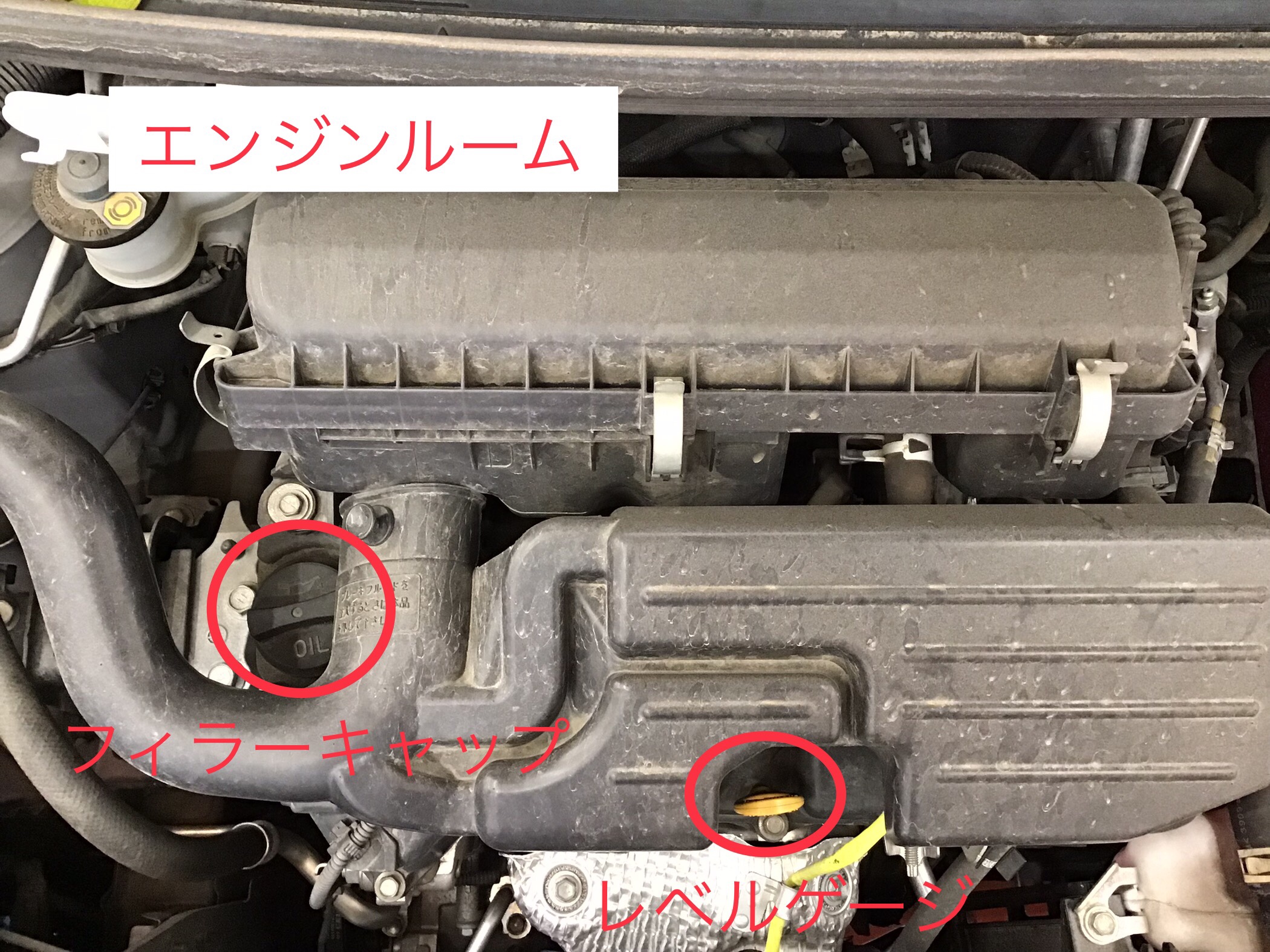 まずはボンネットを開けフィラーキャップとゲージの位置確認!