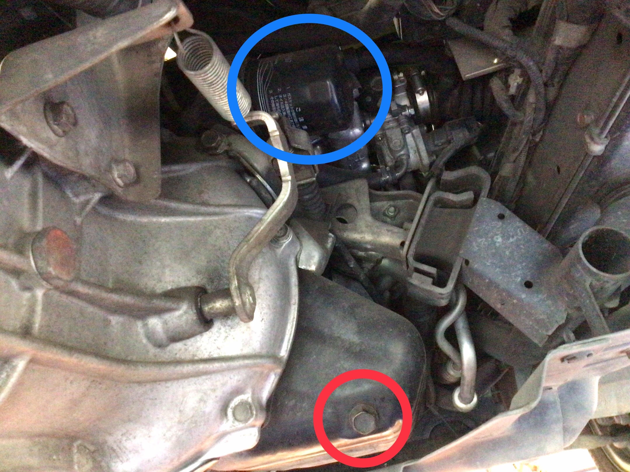 青丸がエレメント赤丸がドレンボルトになります!