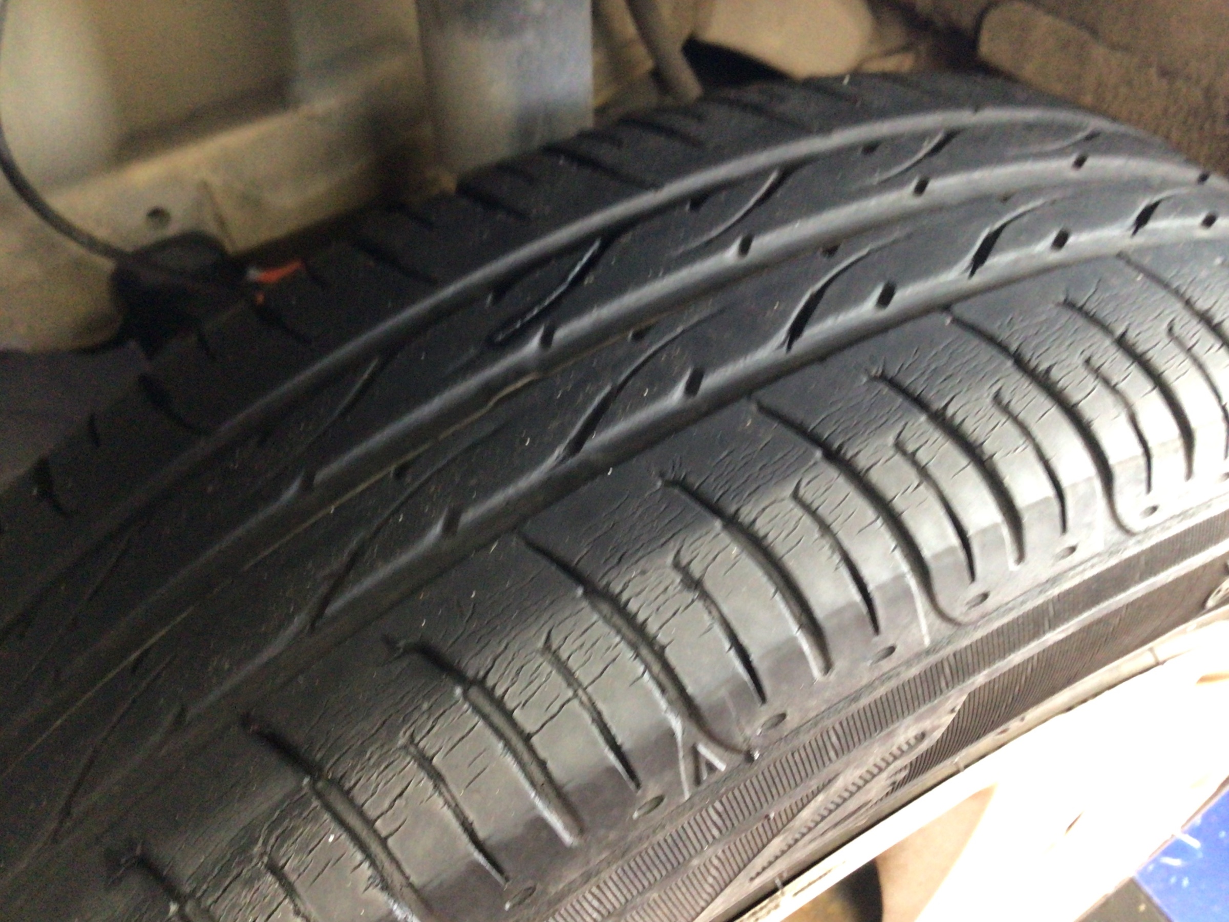 タイヤの溝は減っており、ひび割れもかなり進行している