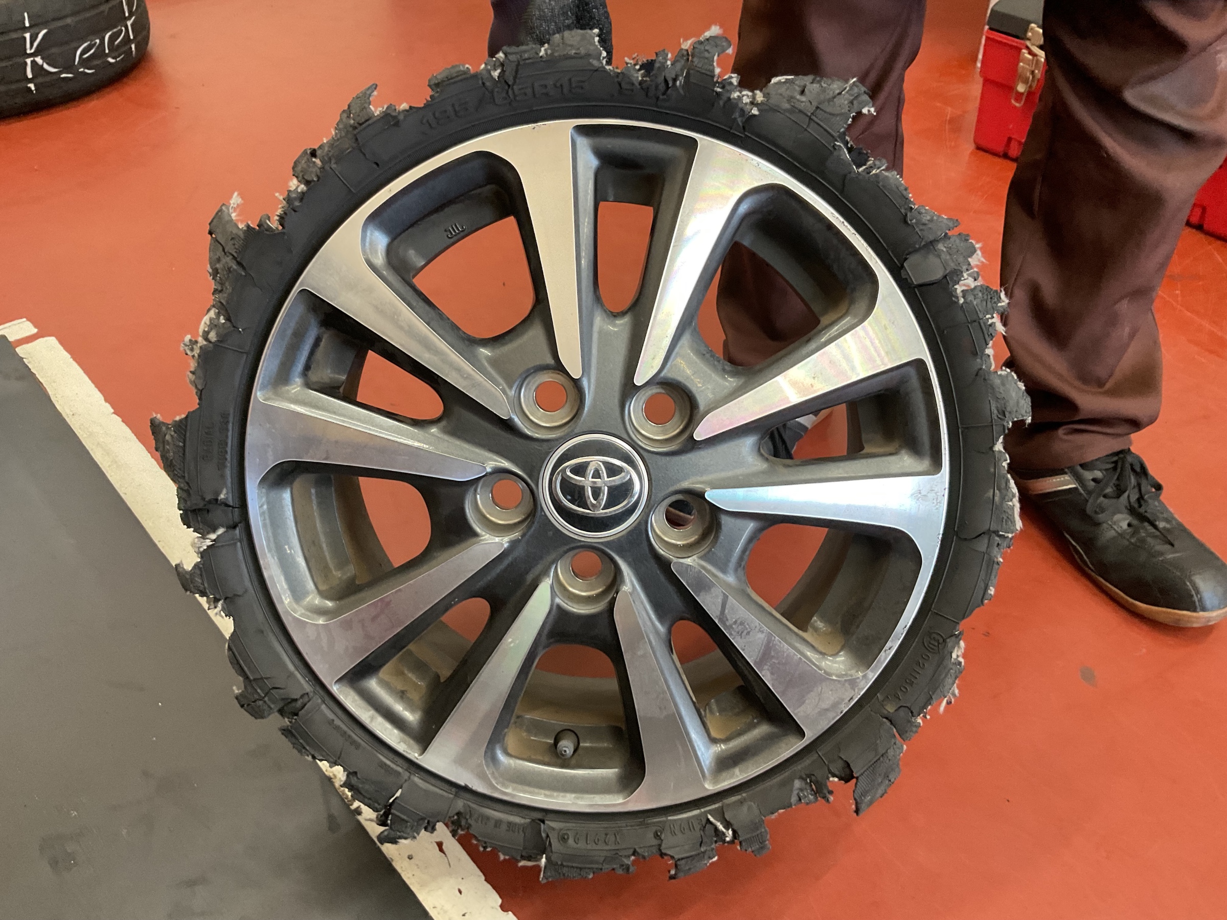 空気圧を充填すると内面はボロボロなのでタイヤは爆発します。
