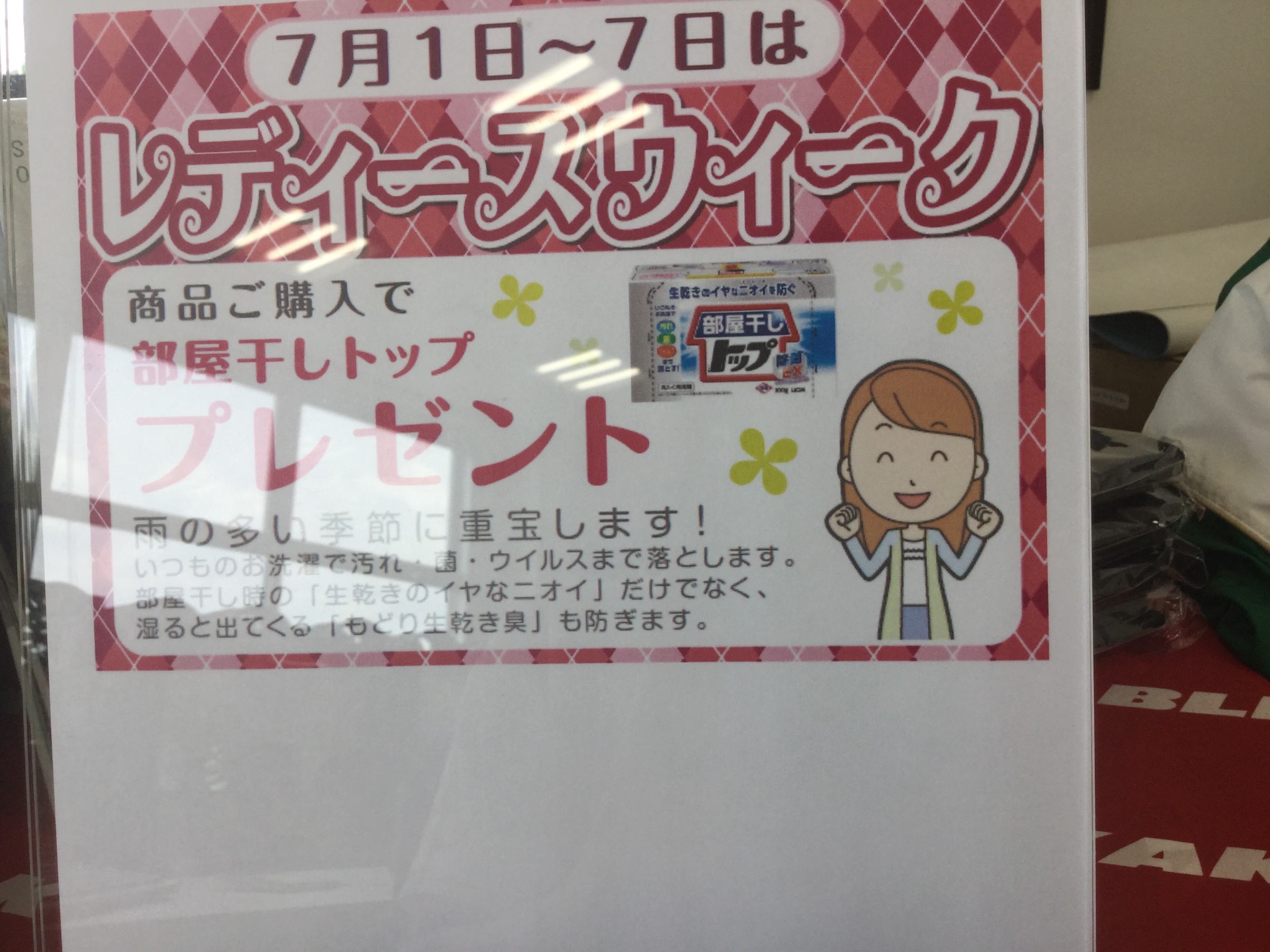 レディースWEEK!! ポスト 2018年7月1日 こんにちは。 もう7月に入り梅雨もあけて暑くなるこの時期。 1日から7日までレディースWEEKをやっています!! 女性の方限定、商品をご購入で部屋干しトップ プレゼント。 毎月変わりますのでぜひご利用ください^^