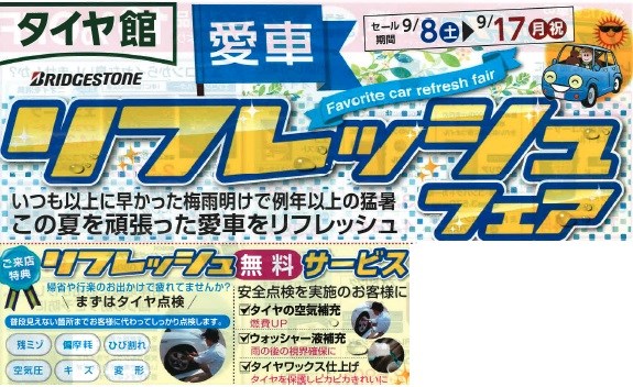 今日からリフレッシュフェアー開催しますよ(^0^) ポスト 2018年9月8日 こんにちは!! 本日9/8から9/17までリフレッシュフェアーを開催しますよ^^ タイヤの空気圧やタイヤ点検、エンジンルームの点検無料でやってますよ(^0^) たくさんのご来店お待ちしてますm(__)m