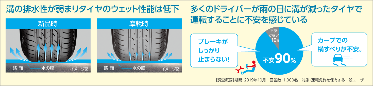 実際に約90%のお客様が摩耗したタイヤでの雨の日の走行に不安を感じていました。