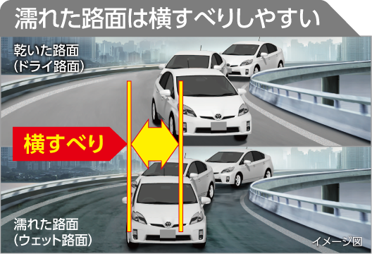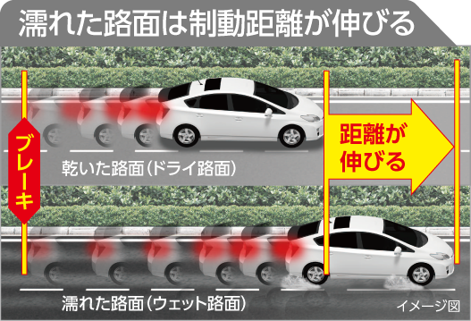 雨の日の制動距離と横滑りのイメージ図 *ブリヂストンサイトより引用