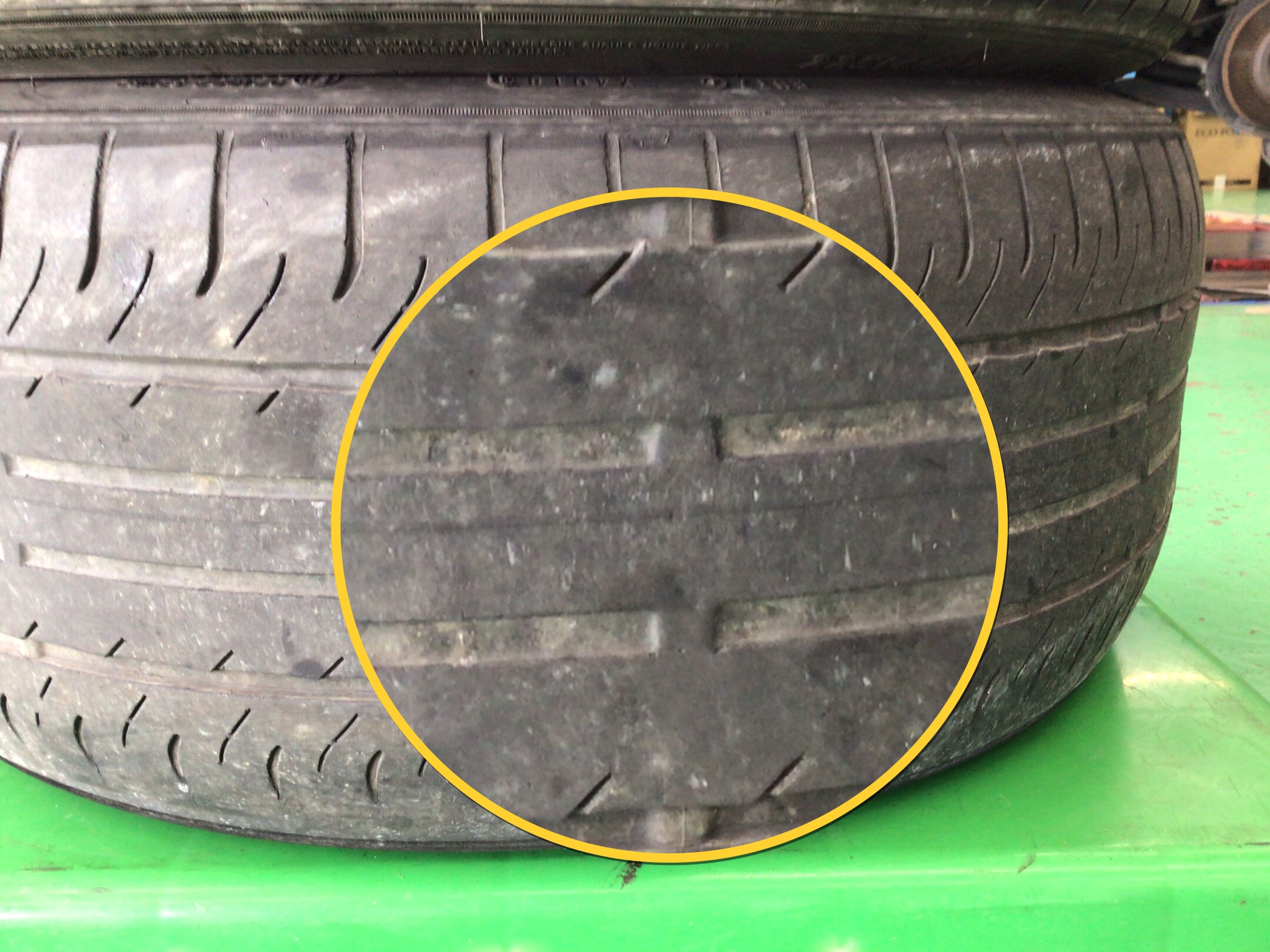 交換前のタイヤは、溝が少なくスリップサインが出ていました。