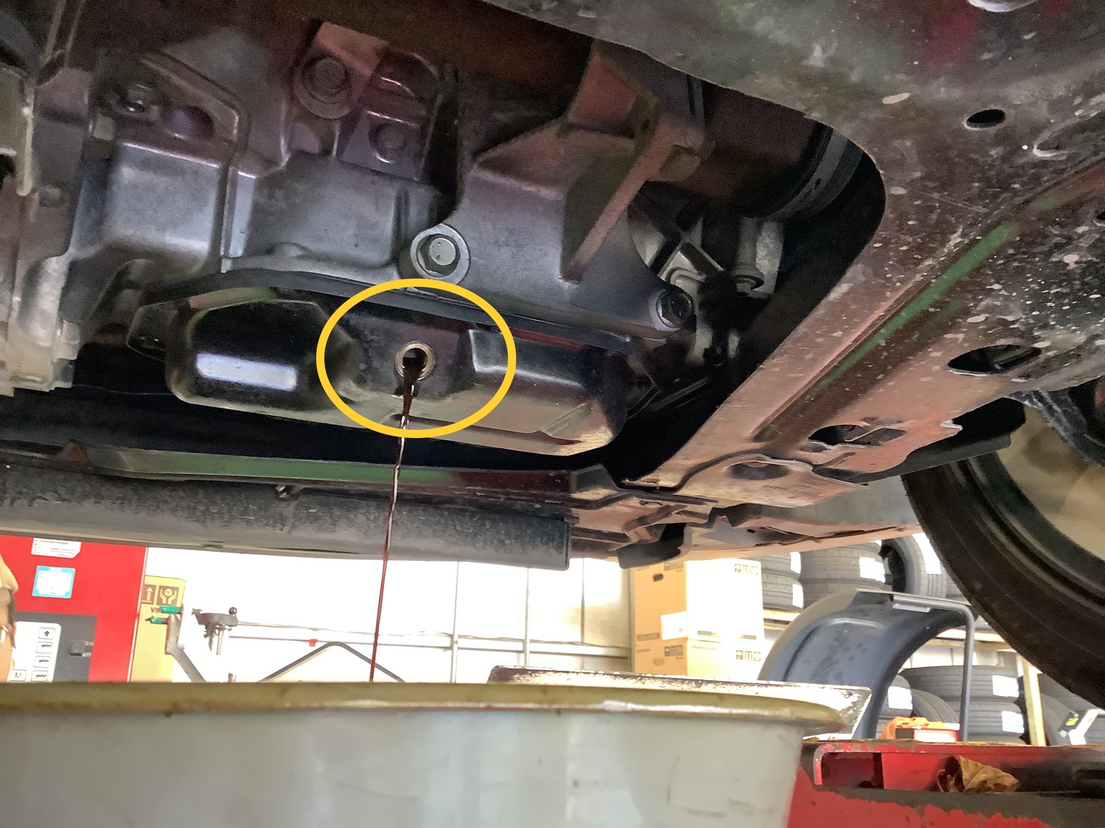 ドレンボルトを外し、下からオイルを抜いていきます。