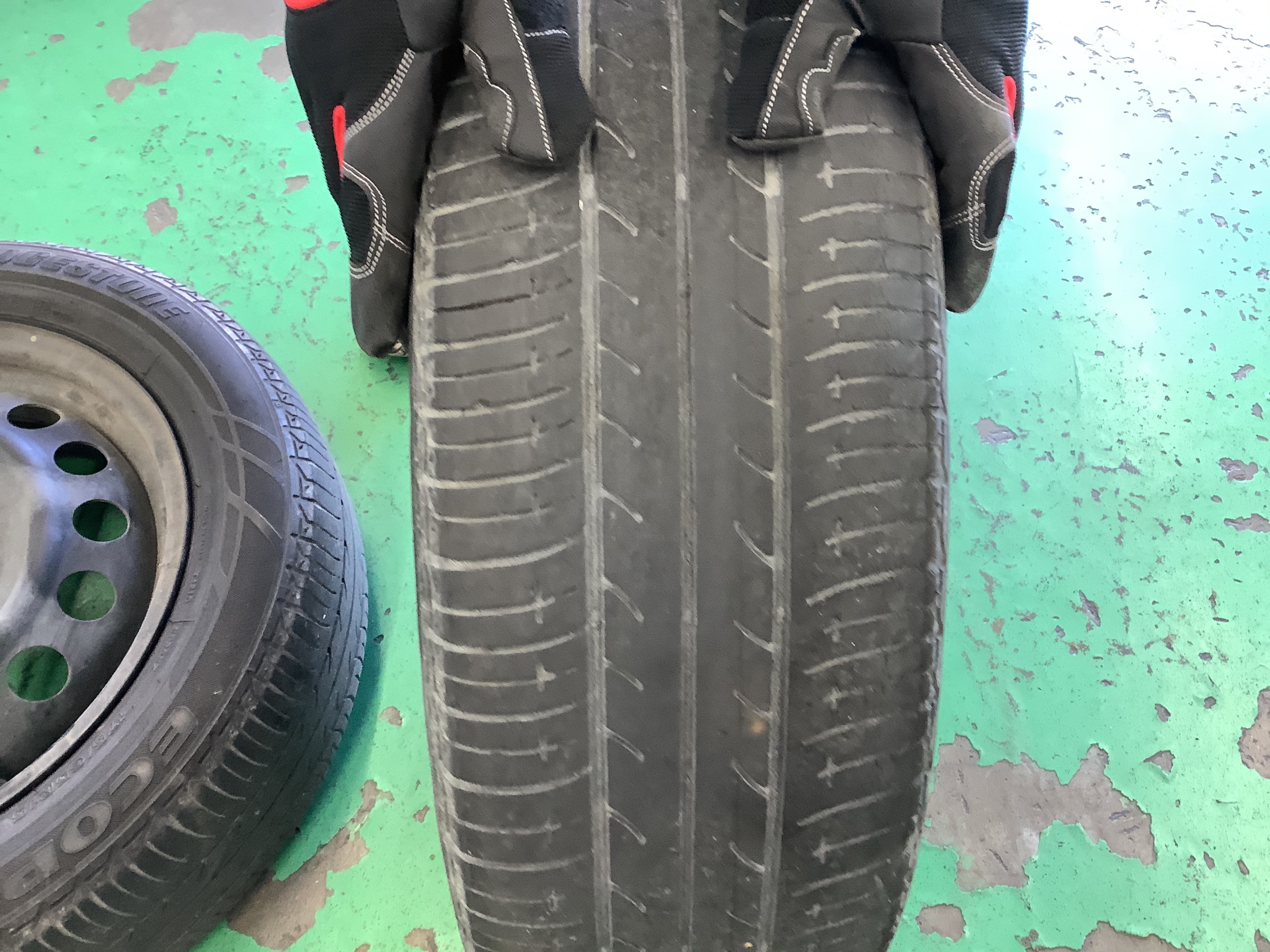 かなり溝は減っていますがタイヤの右側が特に減っているのが
