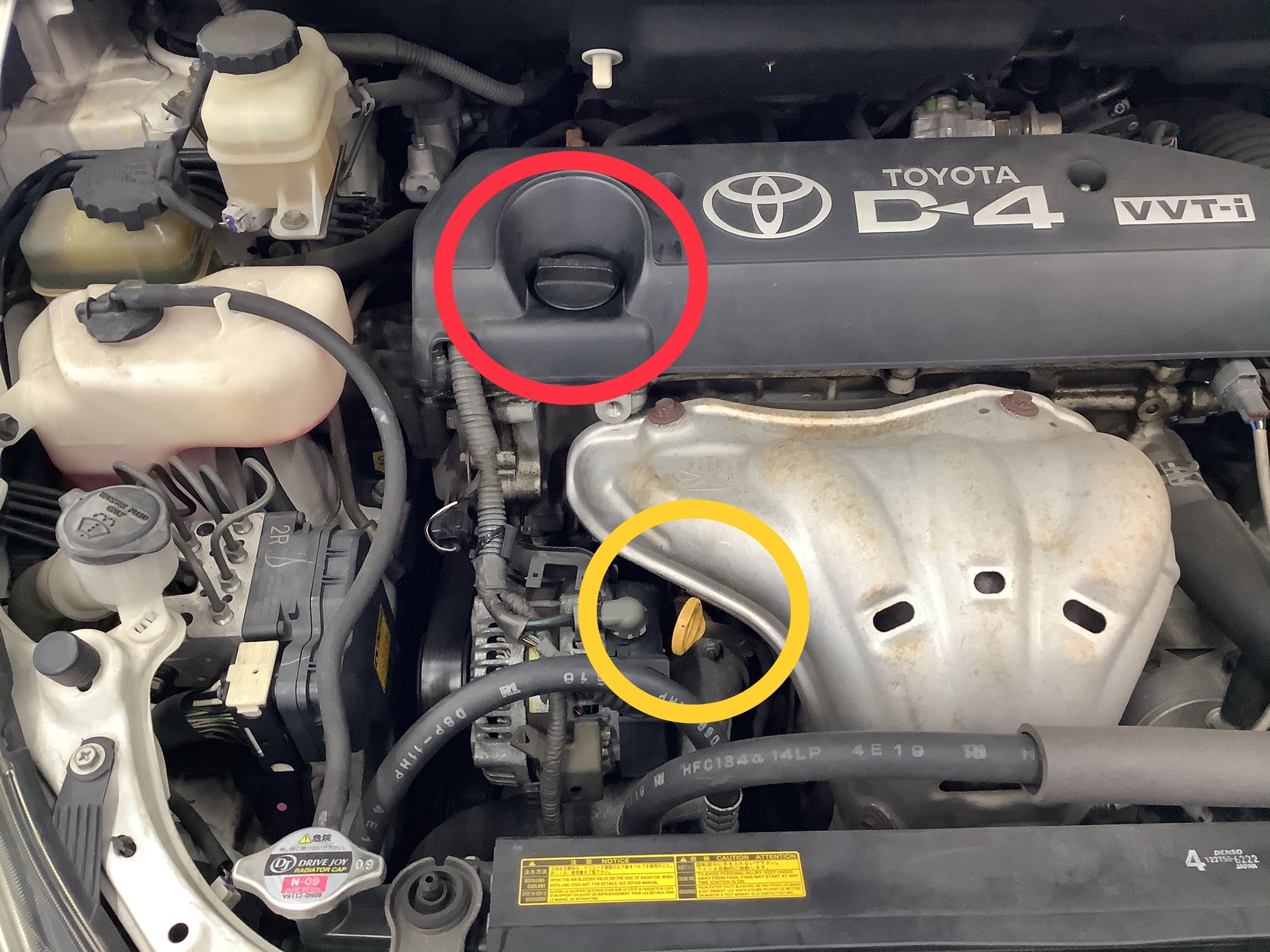 赤丸で囲っている所からオイルを入れていき、黄丸の所が