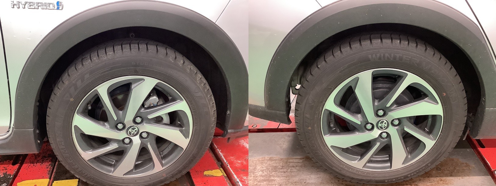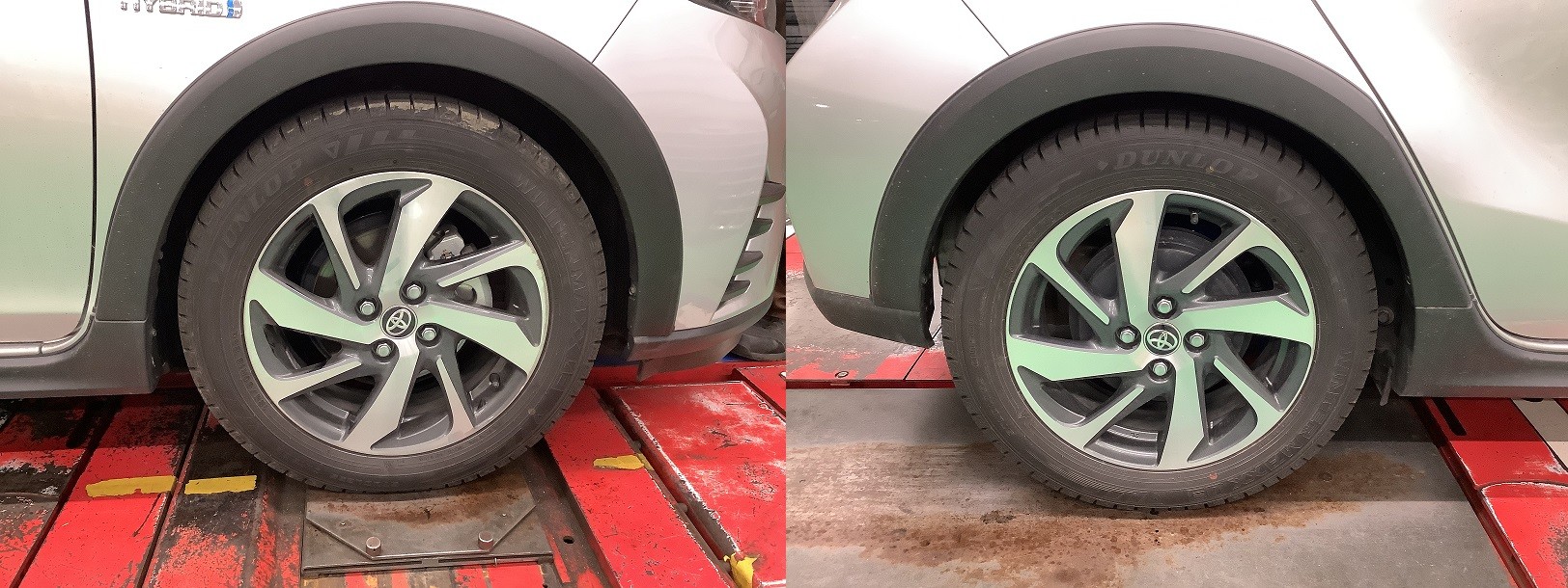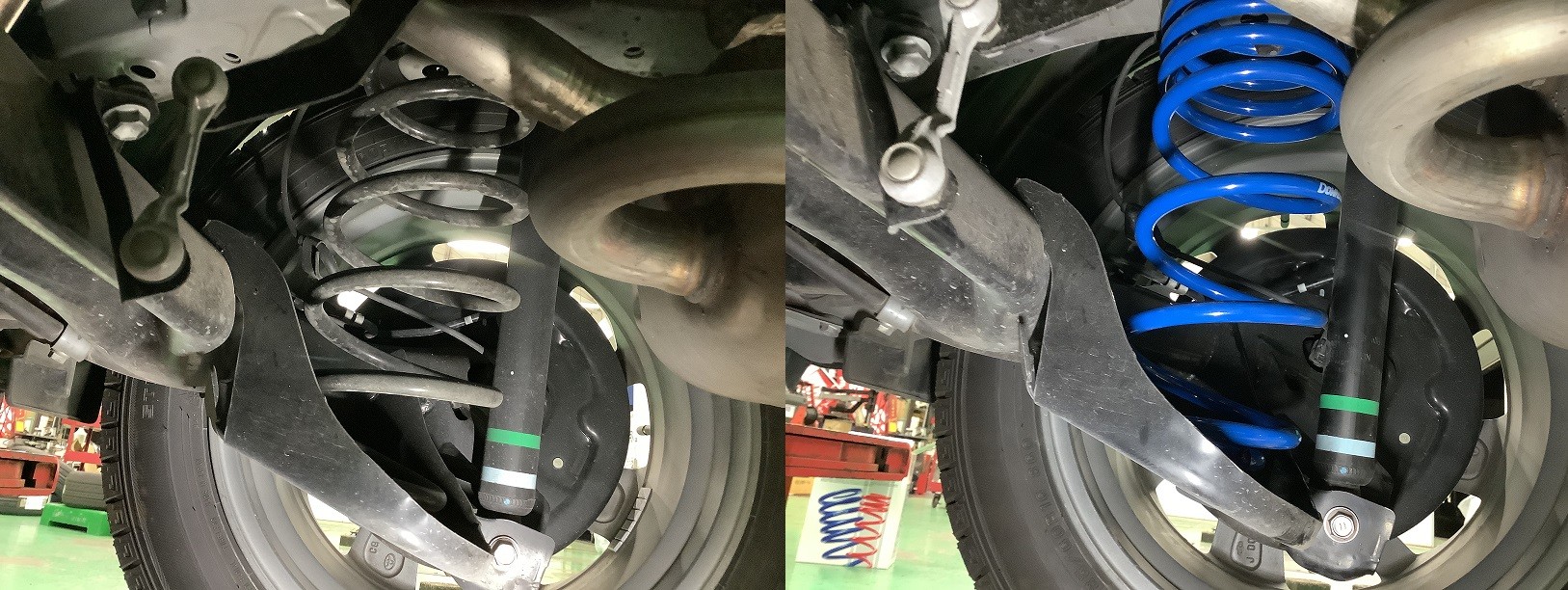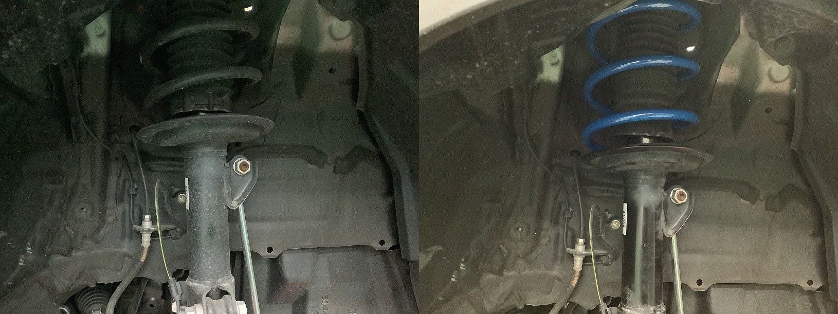 左が純正で右側がダウンサス取付後になります。