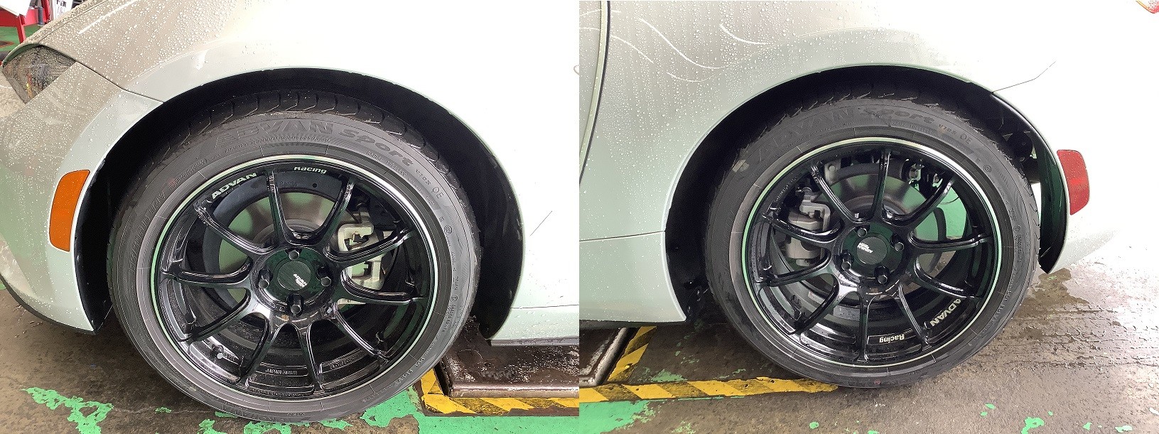 まずは、施工前のタイヤハウスの隙間ですね。ダウンサスが入っているので、気持ち下がっています。ホイールもキマッテますね(*^ω^*)