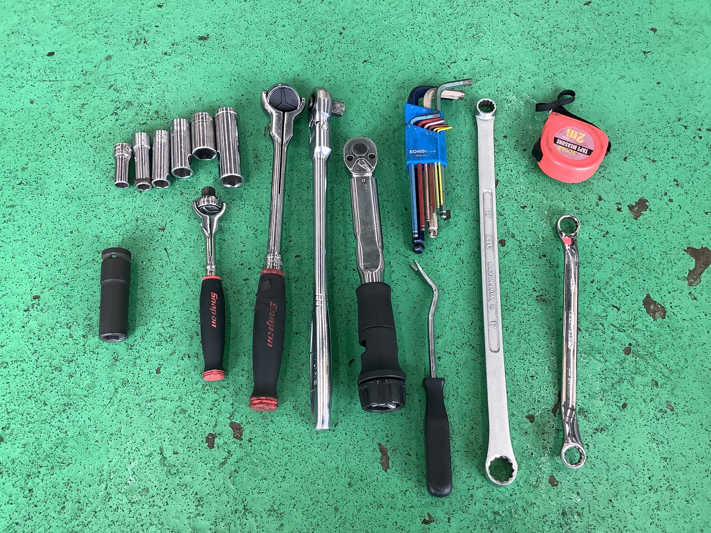 トルクレンチ、ラチェット、六角レンチに12、14、17のメガネにソケットといった感じで大体イケちゃいます٩(๑❛ᴗ❛๑)۶