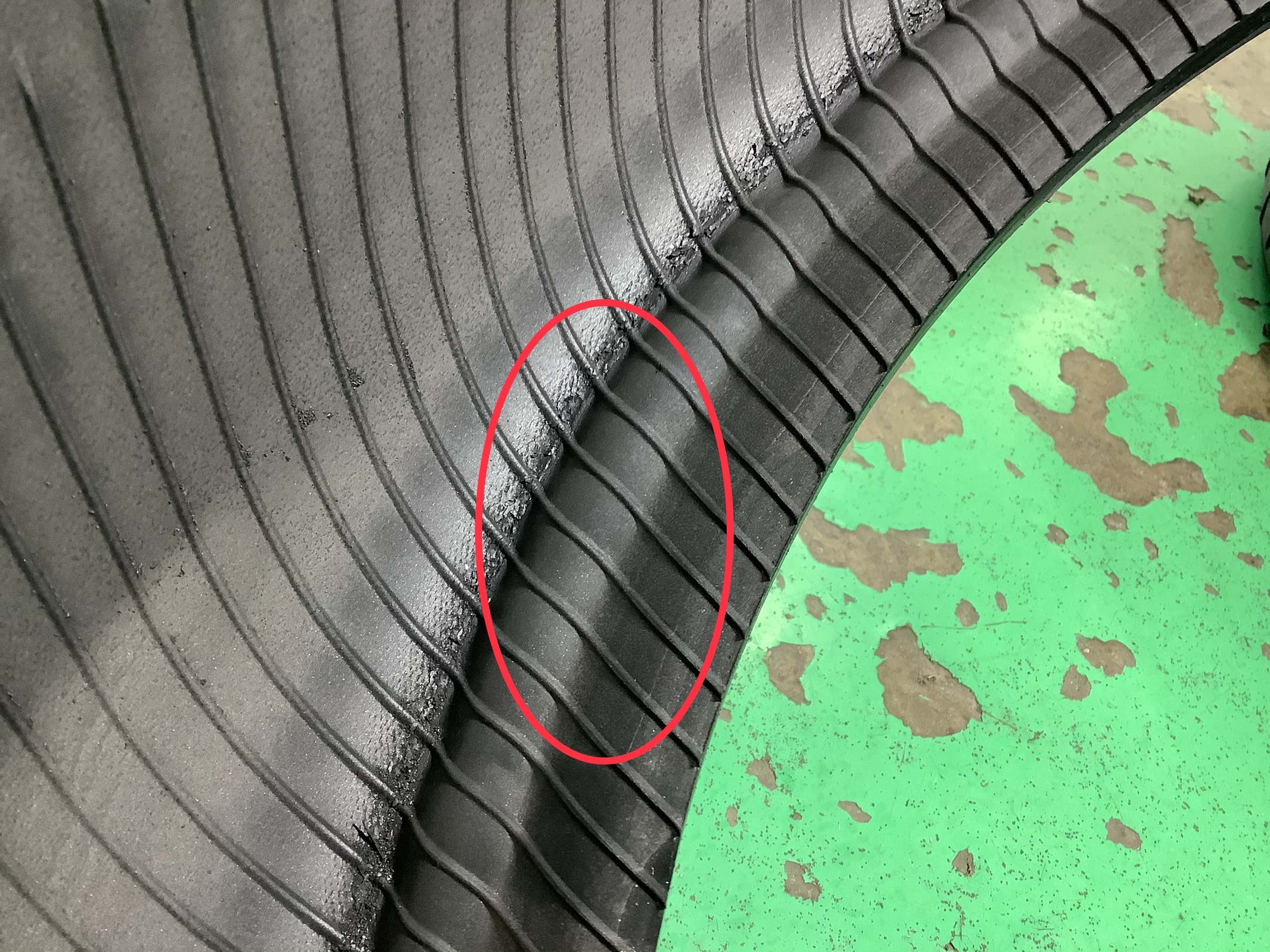 赤い丸をつけていますが、タイヤ一周に膨らみが‼️こちらは『ロードインデックス不足』が原因によるものです(๑•ૅㅁ•๑)