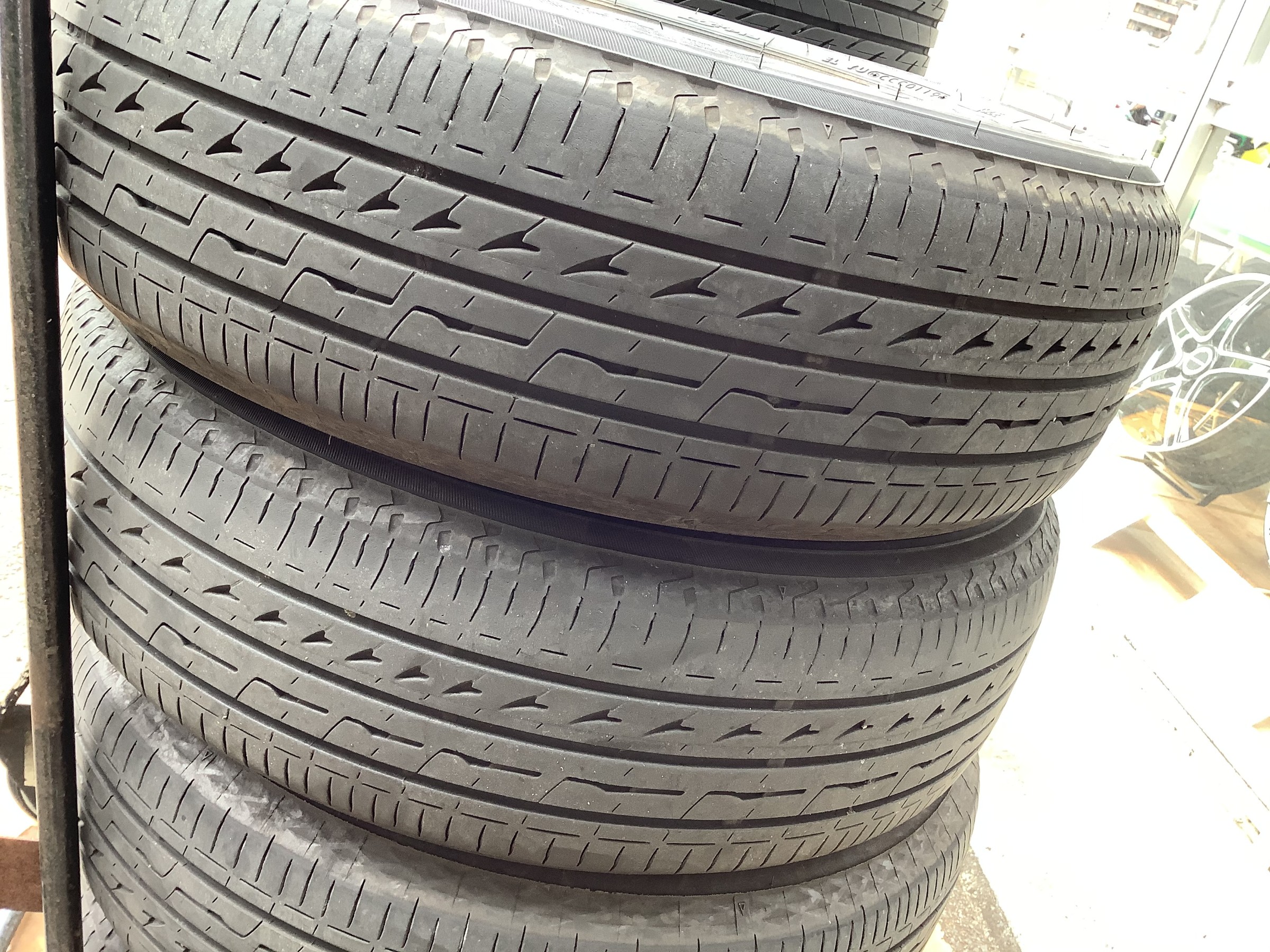全体的に、残溝は残り2〜3ミリある感じです。大体、このぐらいで交換を考えるお客様が統計的にも多いかと思います。保安基準では、1.6ミリ以下は走行してはならないと有りますので、そこまで行くと今度は、排水性が著しく低下して安全性に関わって来ます。