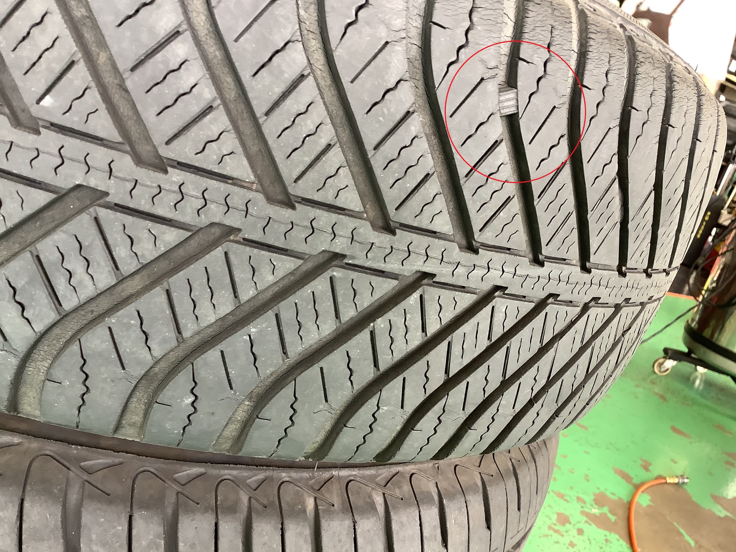 今まで使っていたタイヤΣ(-᷅_-᷄๑)⁉️オールシーズンタイヤを使っていらしました。赤い丸の部分が、冬タイヤとして見るポイント『プラットホーム』です。コチラはもうほぼ露出してますね。露出したら、冬タイヤとしての性能が低下しますので交換を推奨しますというタイミングです。