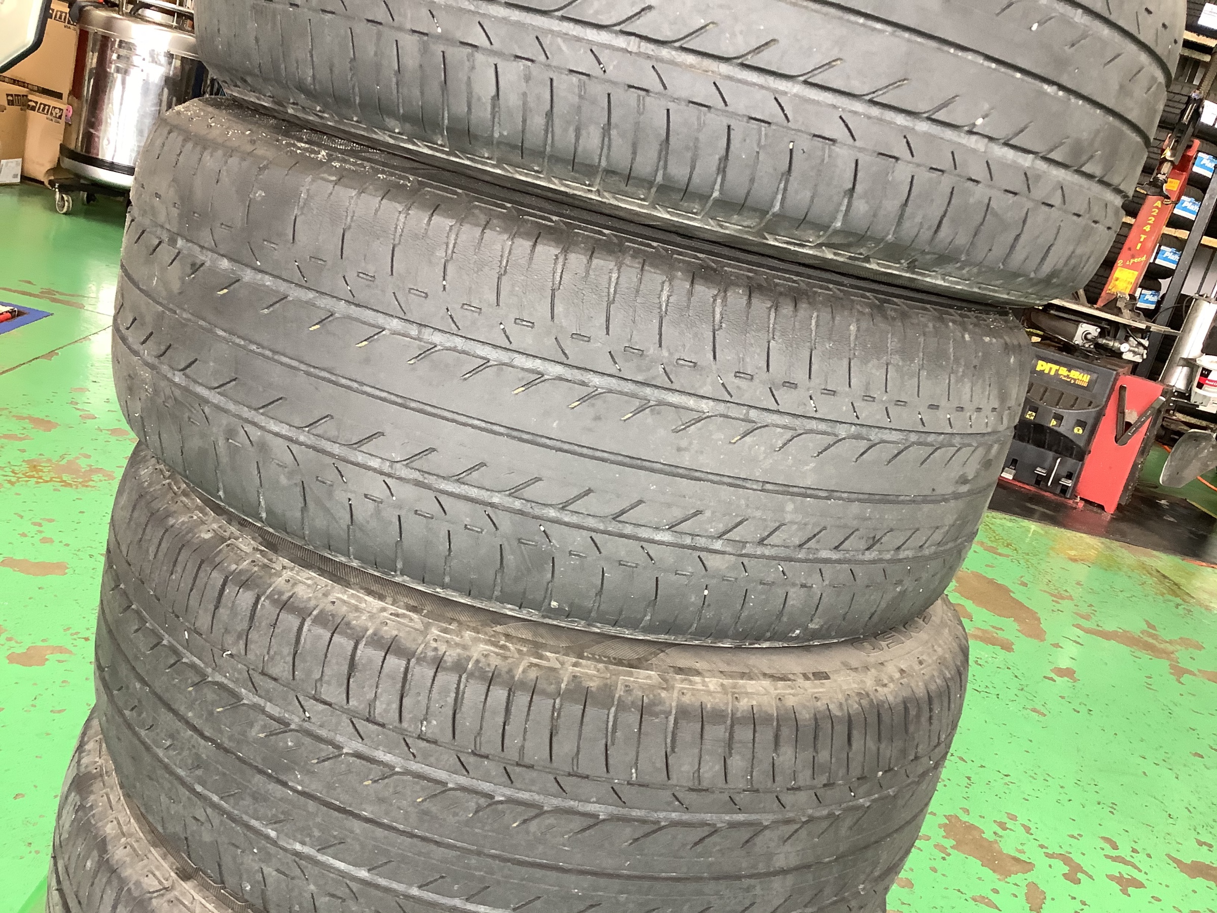 外したタイヤです。溝はまだ3ミリでしたが有りました。しかし、タイヤのヒビ割れ、残溝数等を考慮して、かつ、最初に触れましたが、乗り心地等を含めて交換させて頂きましたm(__)m