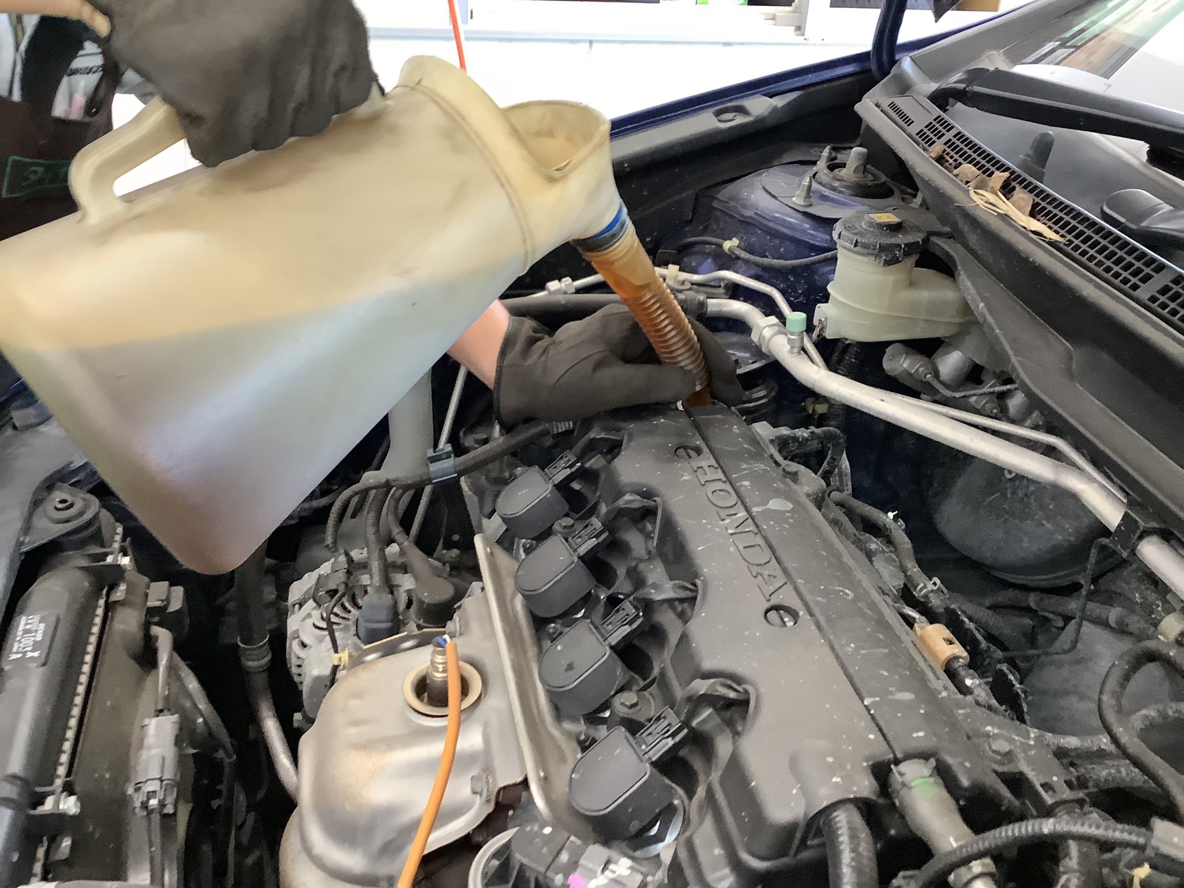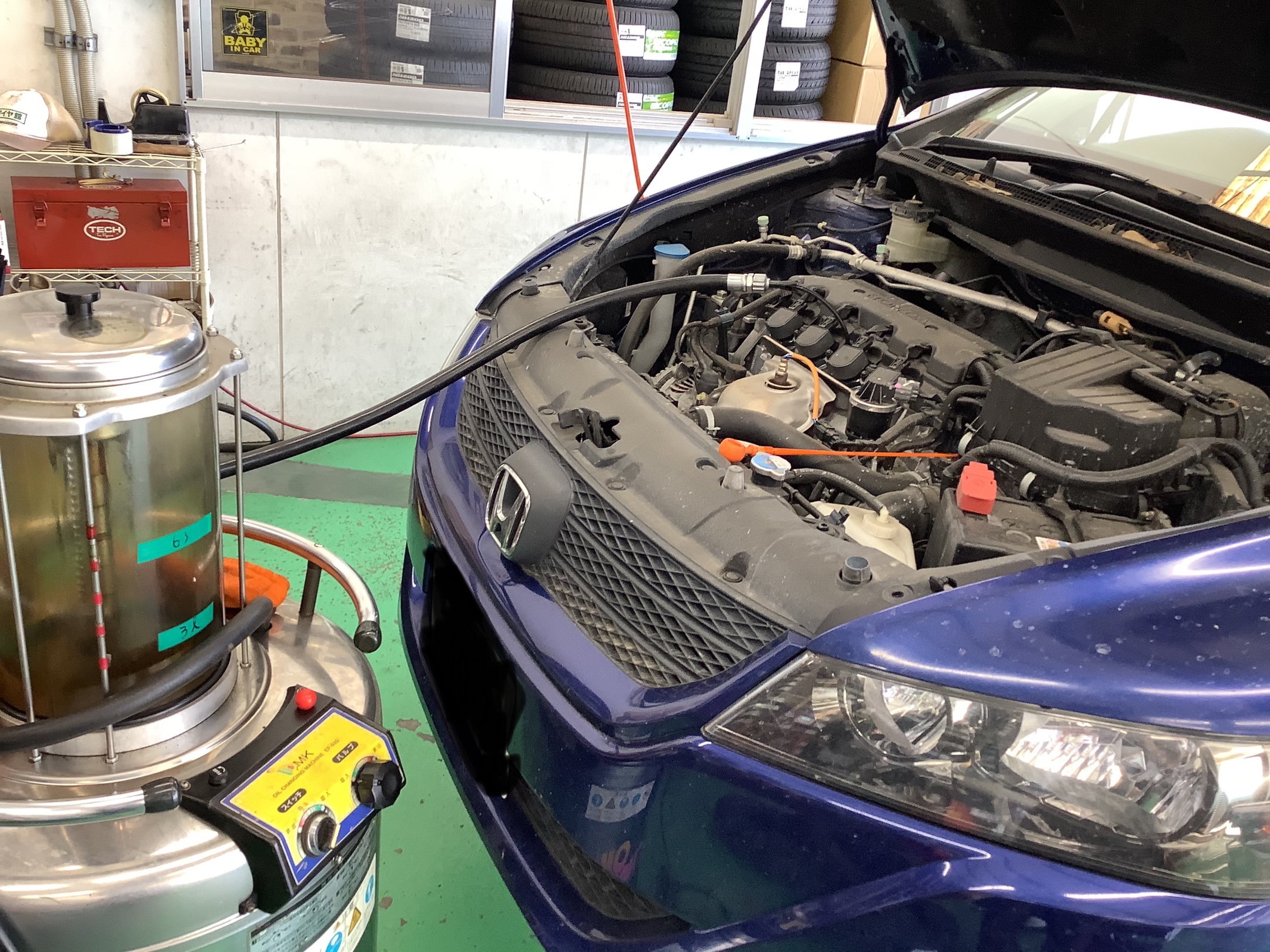ピットに入庫してオイルを上抜きしていきます。上抜きした方が、ドレンボルトを緩めて排出する必要性がないので、無駄なトラブルを防ぎかつ、綺麗に抜き取る事ができます。