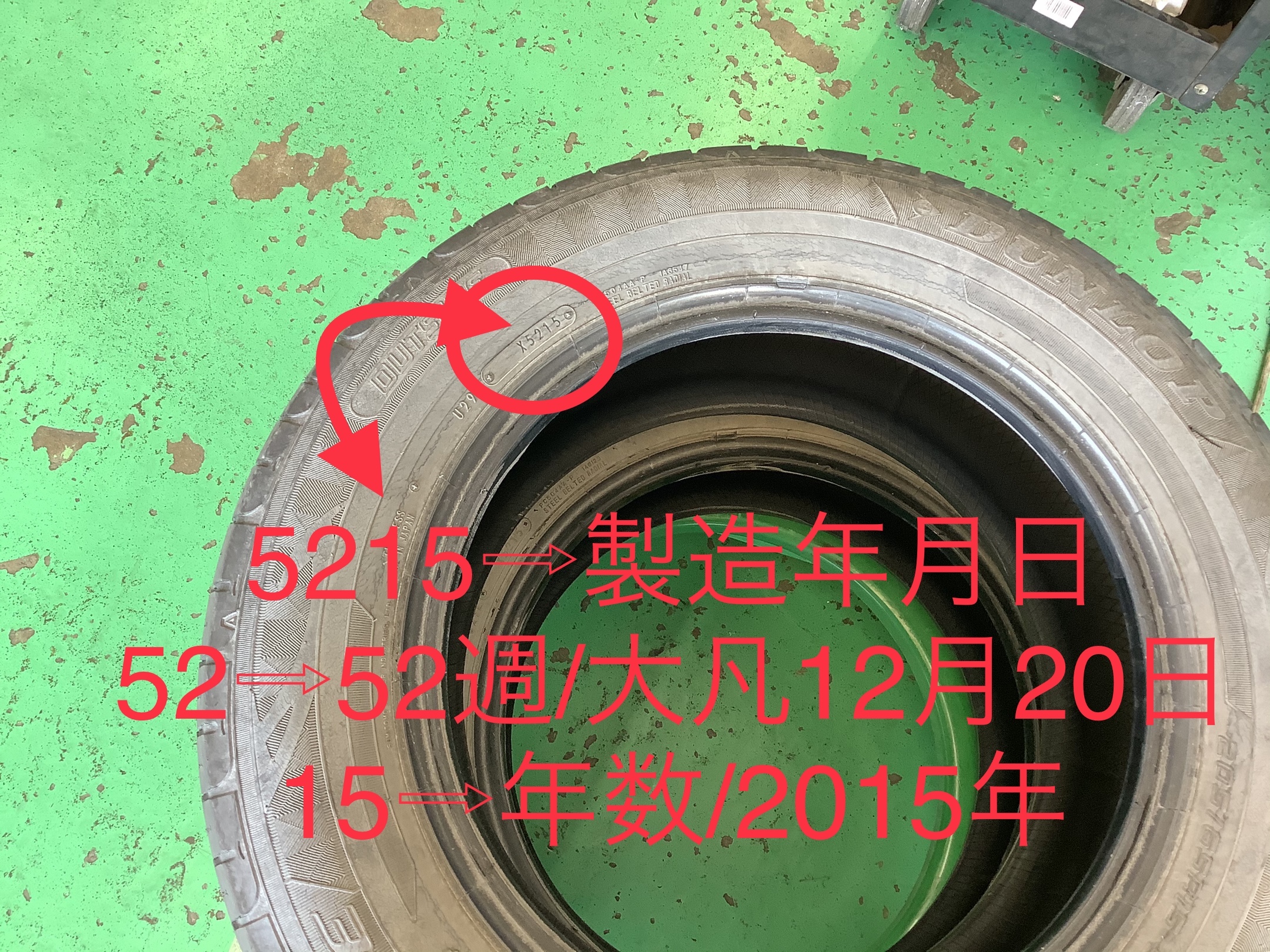 外したタイヤです。ひび割れがスゴイデスネ......画像に書かせて貰いましたが、〇で囲っている部分にタイヤの製造年月日が刻印されています。このタイヤの場合、5215なので2015年の12月20近辺となります。何週と表記されているので、そちらは、Web上で検索をかけると分かります!ぜひ、自分のタイヤって何時の??って気になった方は、お試しアレ!!