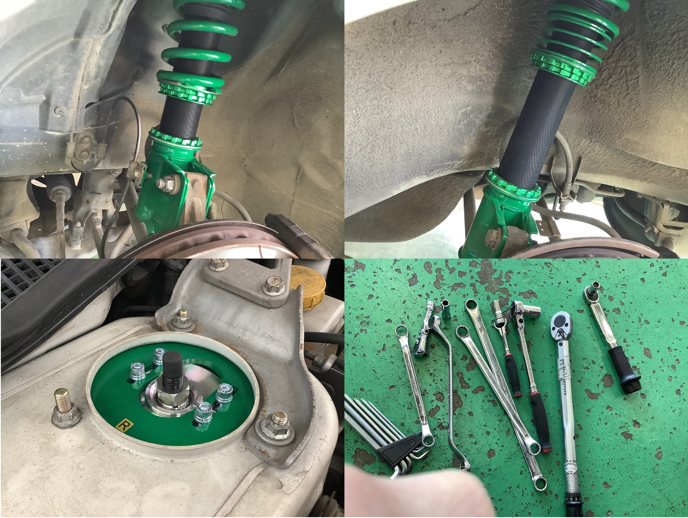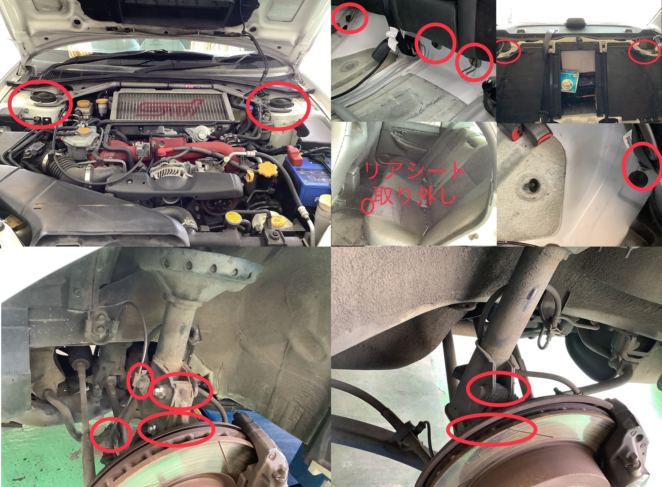 緩めるポイントは、今回、リアシートを外しての作業が伴います。他は、特段、前後ストラット、年代によっては、ボルト、ナット固着によるトラブルを注意しながらの作業になります。