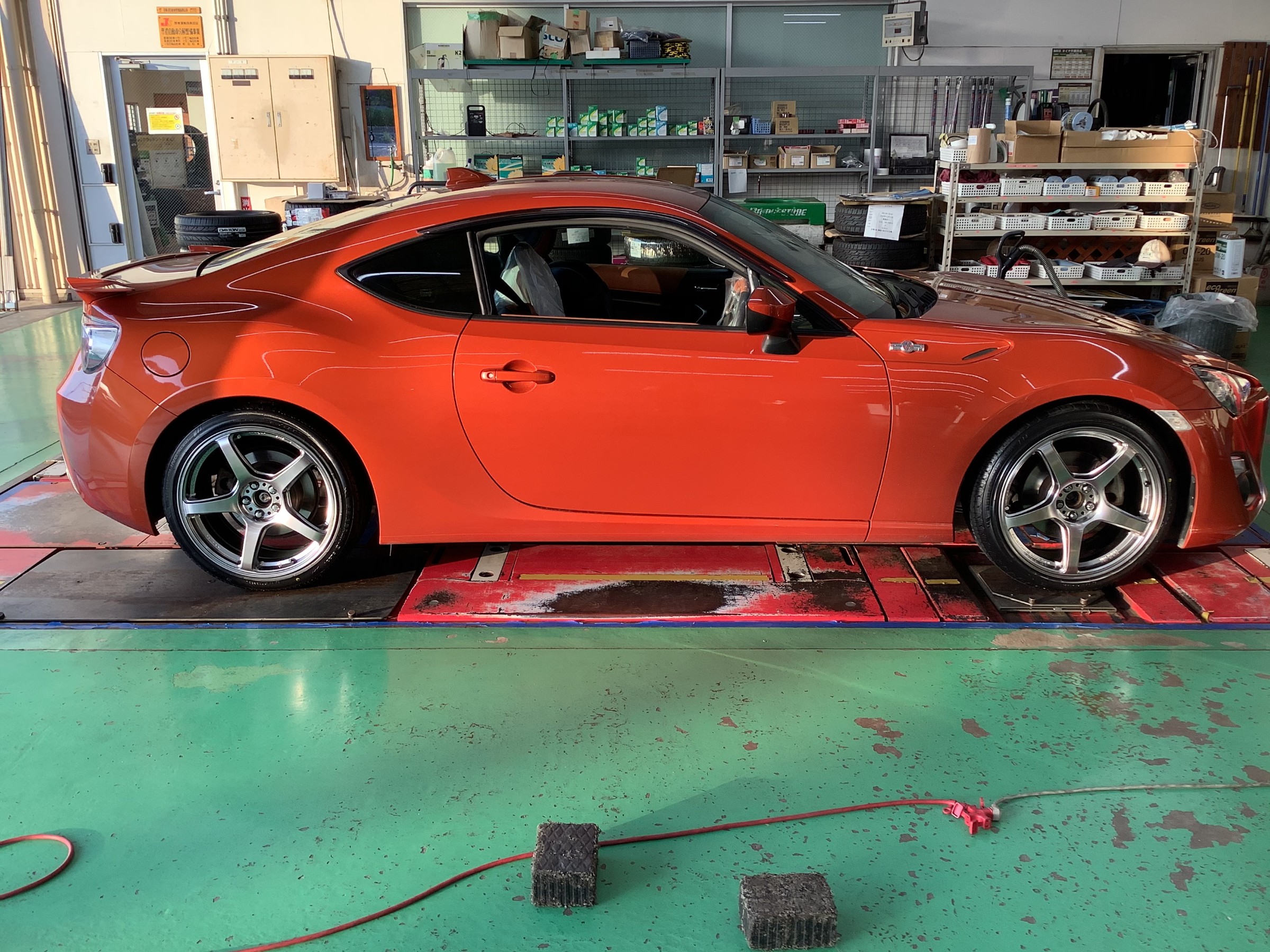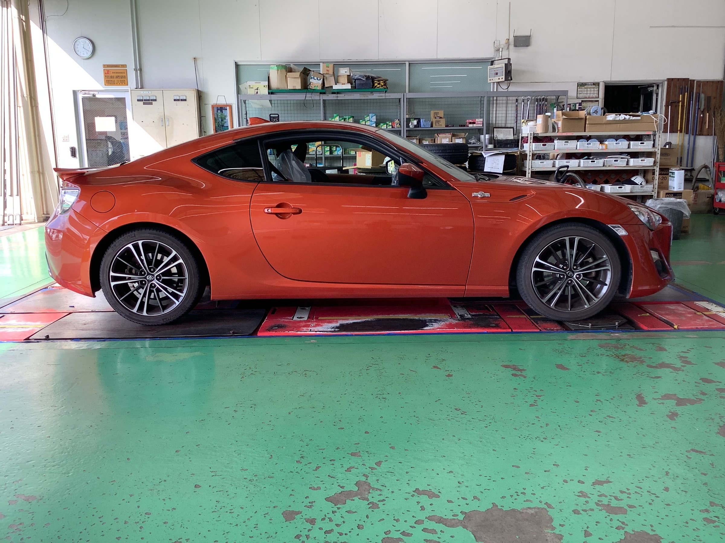 純正ホイールでの状態です。車高は以前に当店で車高調を組ませて貰っています。86のこのボディカラーのオレンジいい色ですよね(●´ω`●)