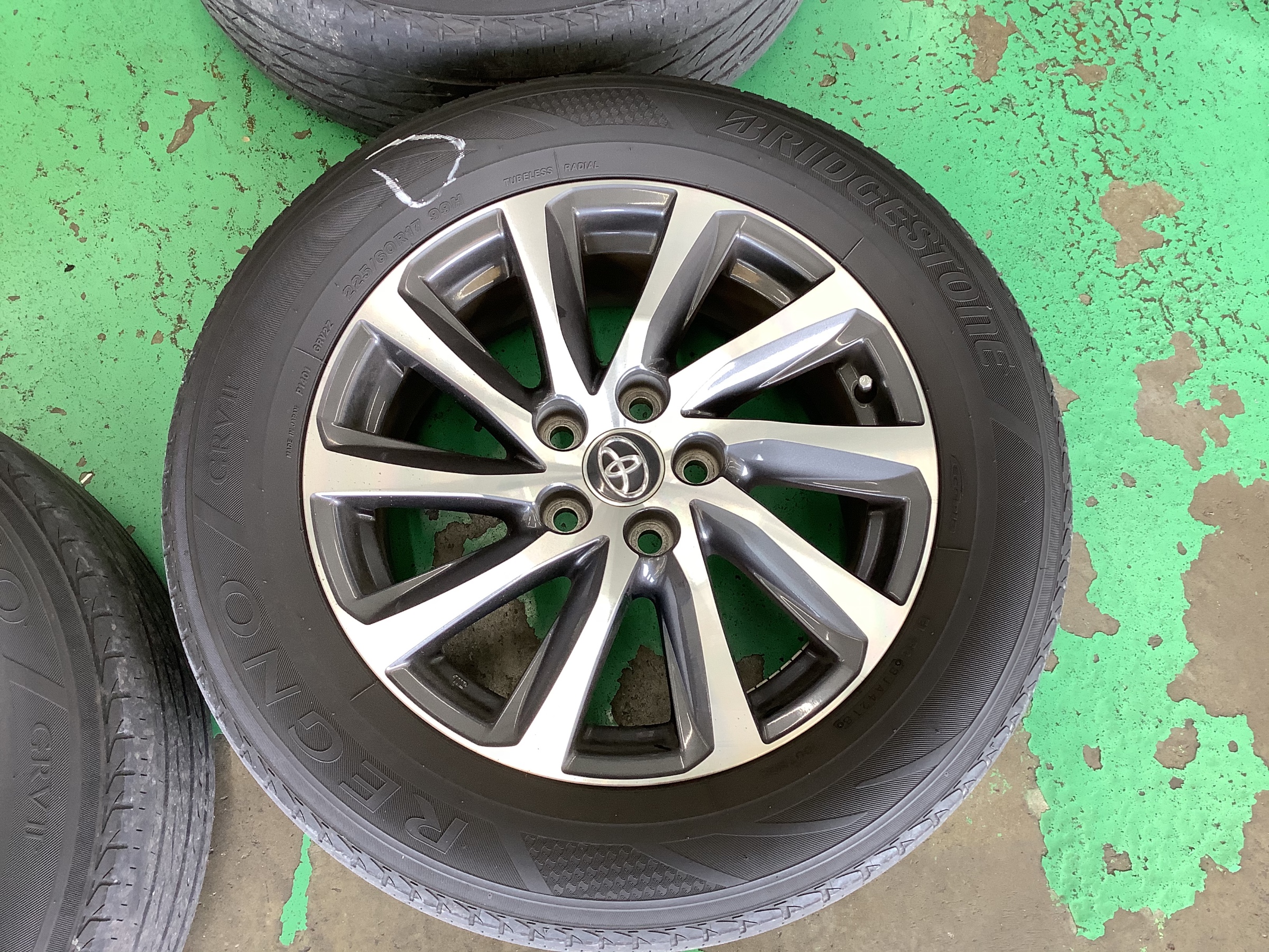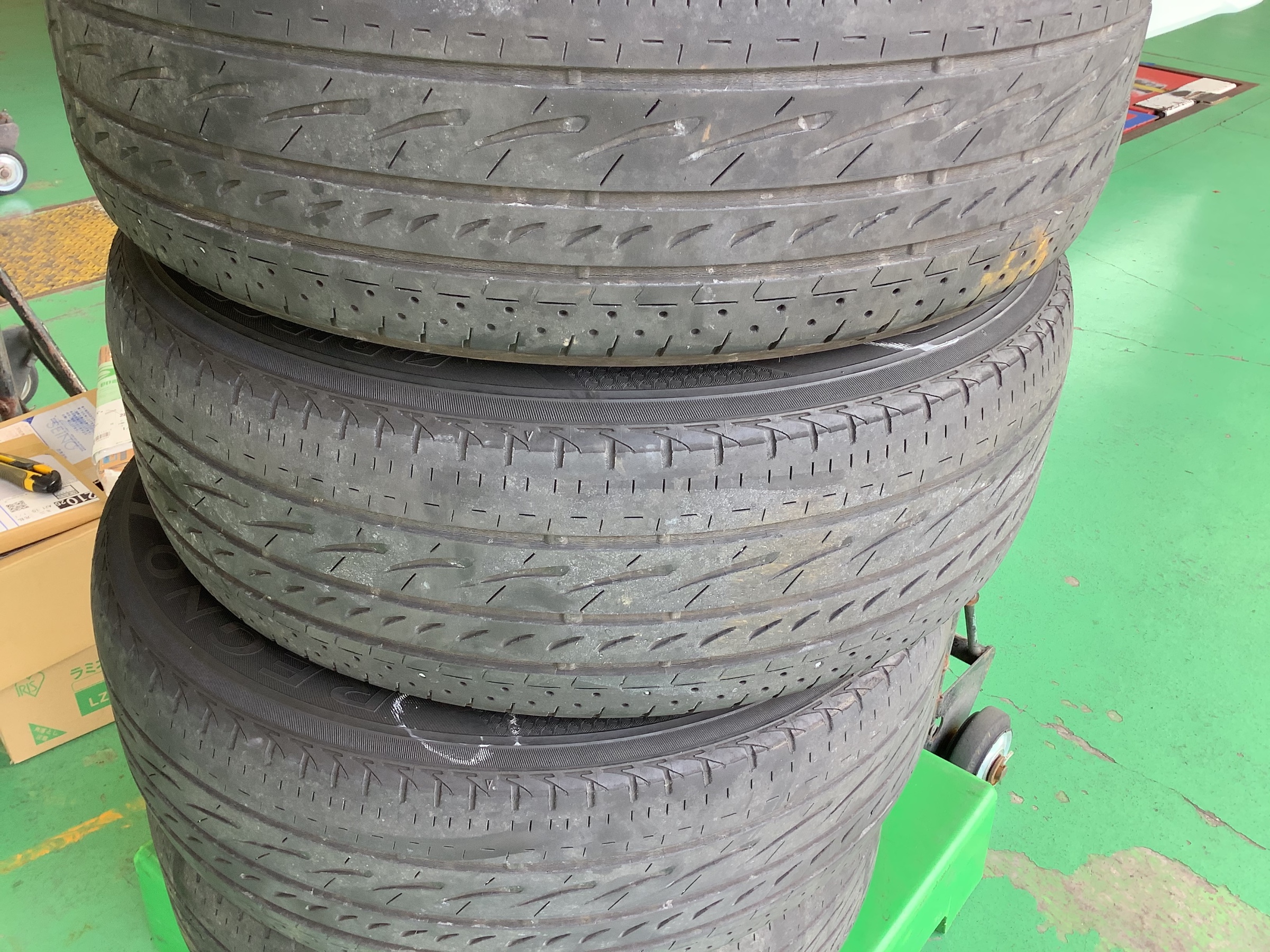 外したタイヤになりますが、全体的に溝が少なく交換時期を迎えてました。ショルダー部がミニバン特有のヘリがありましたので、タイヤ交換と一緒にアライメントもセットで作業させて頂きました(^з^)-☆