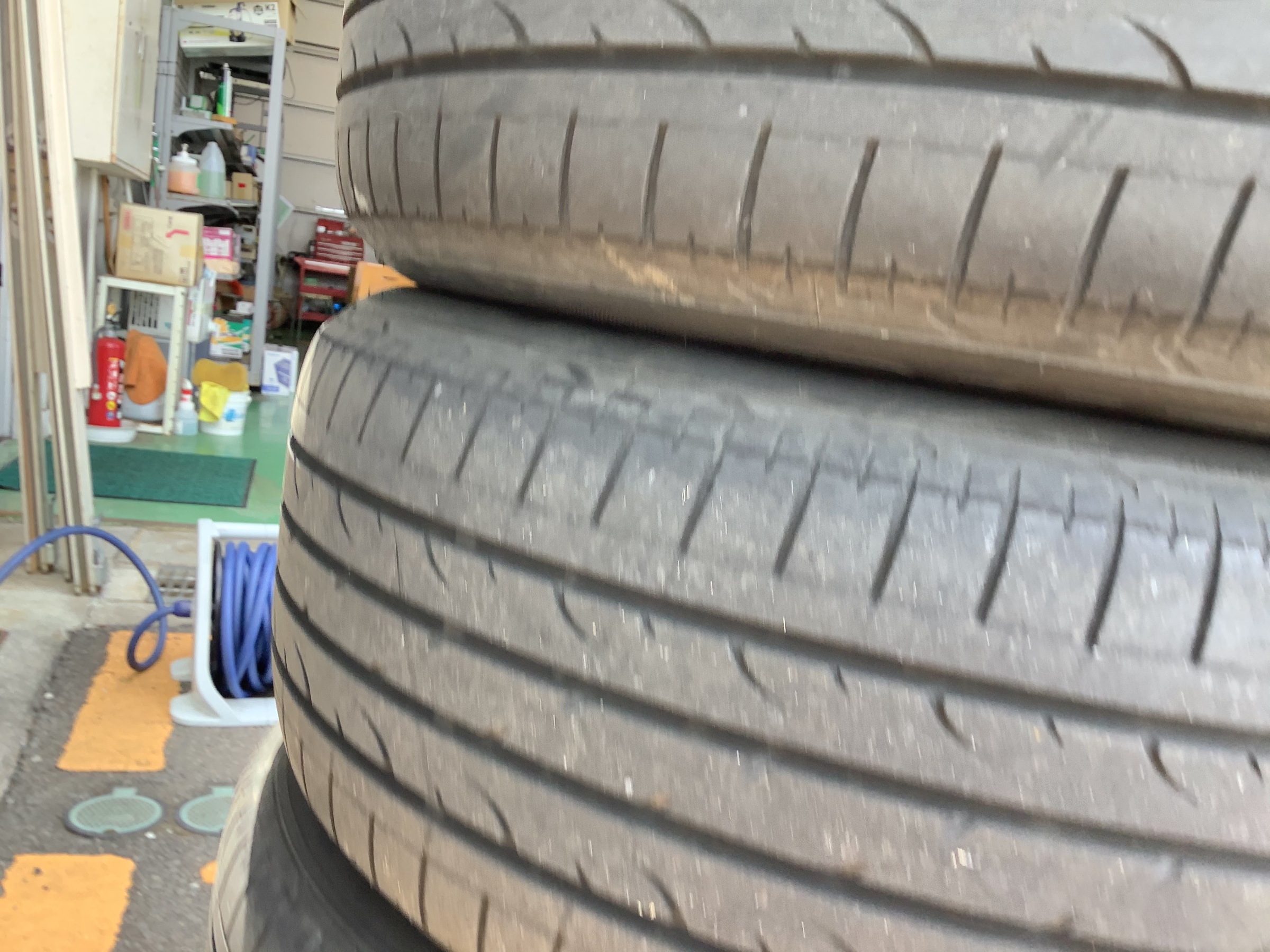全体的に、残溝は残り2〜3ミリある感じです。大体、このぐらいで交換を考えるお客様が統計的にも多いかと思います。保安基準では、1.6ミリ以下は走行してはならないと有りますので、そこまで行くと今度は、排水性が著しく低下して安全性に関わって来ます。