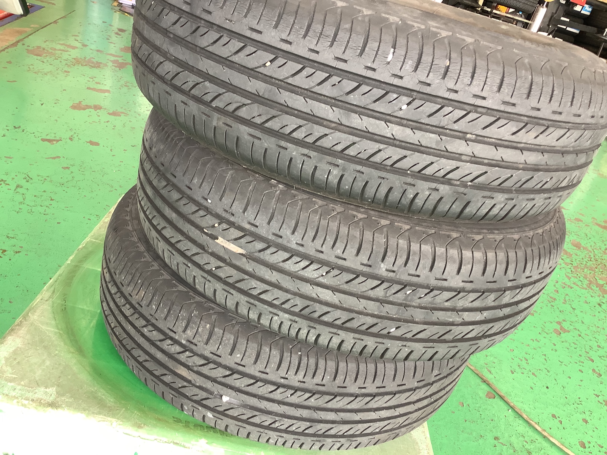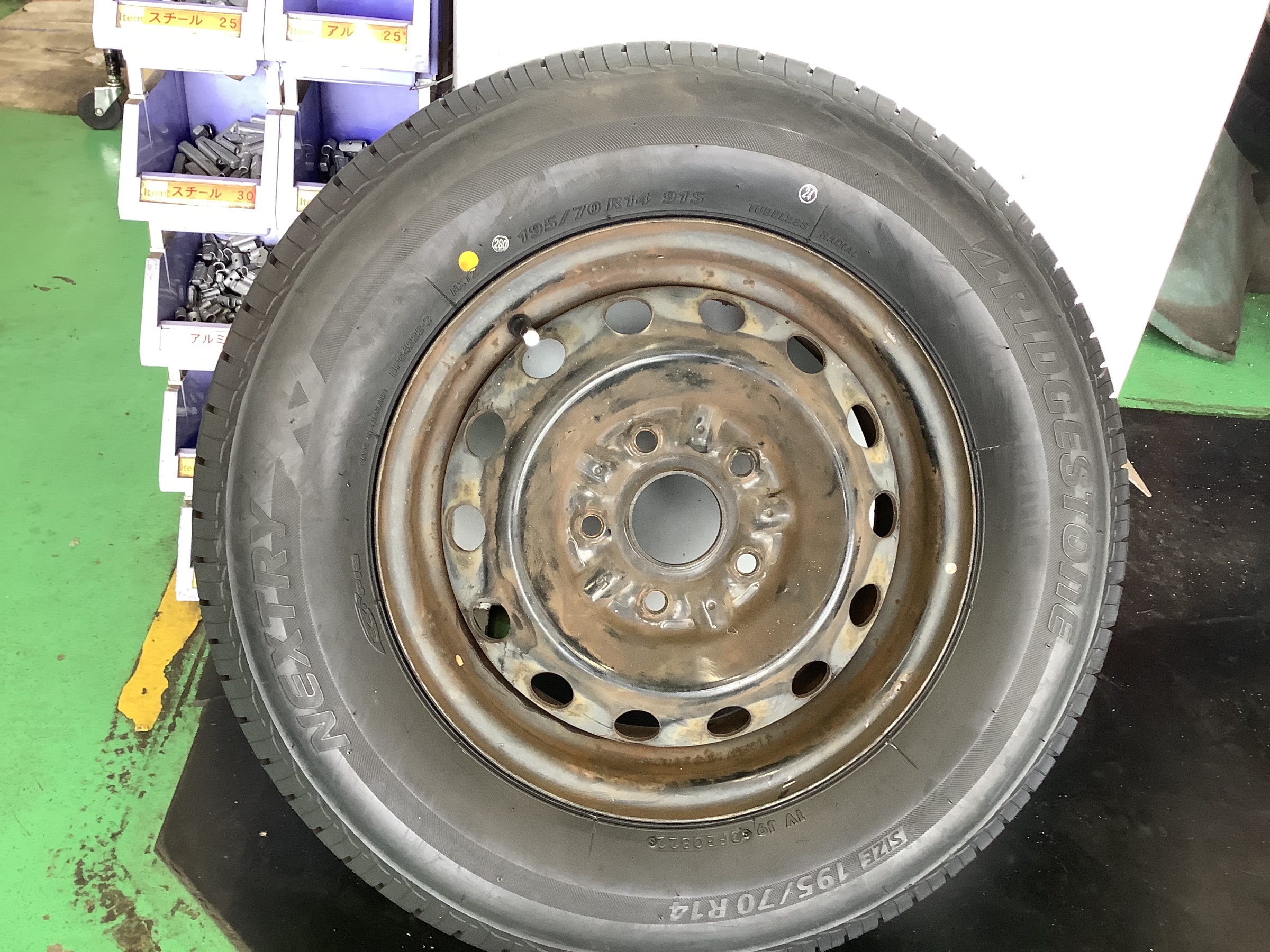 外したタイヤになりますが、道路と接地するトレッド面からサイド面至る所ひび割れが入っていらっしゃいます。ブリヂストンのスニーカーというタイヤになりますね。製造から丸九年たち、タイヤとしての安全性能をかなり、低いとおもわれます。お客様もご認識はされていたみたいなので、交換作業をさせて頂きました!