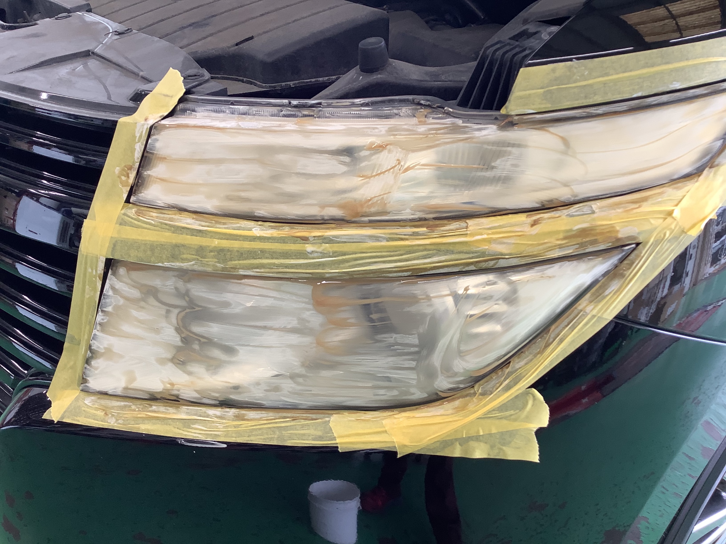 ヘッドライトの淵の所にマスキングをさせて頂き、専用の溶剤で綺麗にしていきます(`_´)ゞ