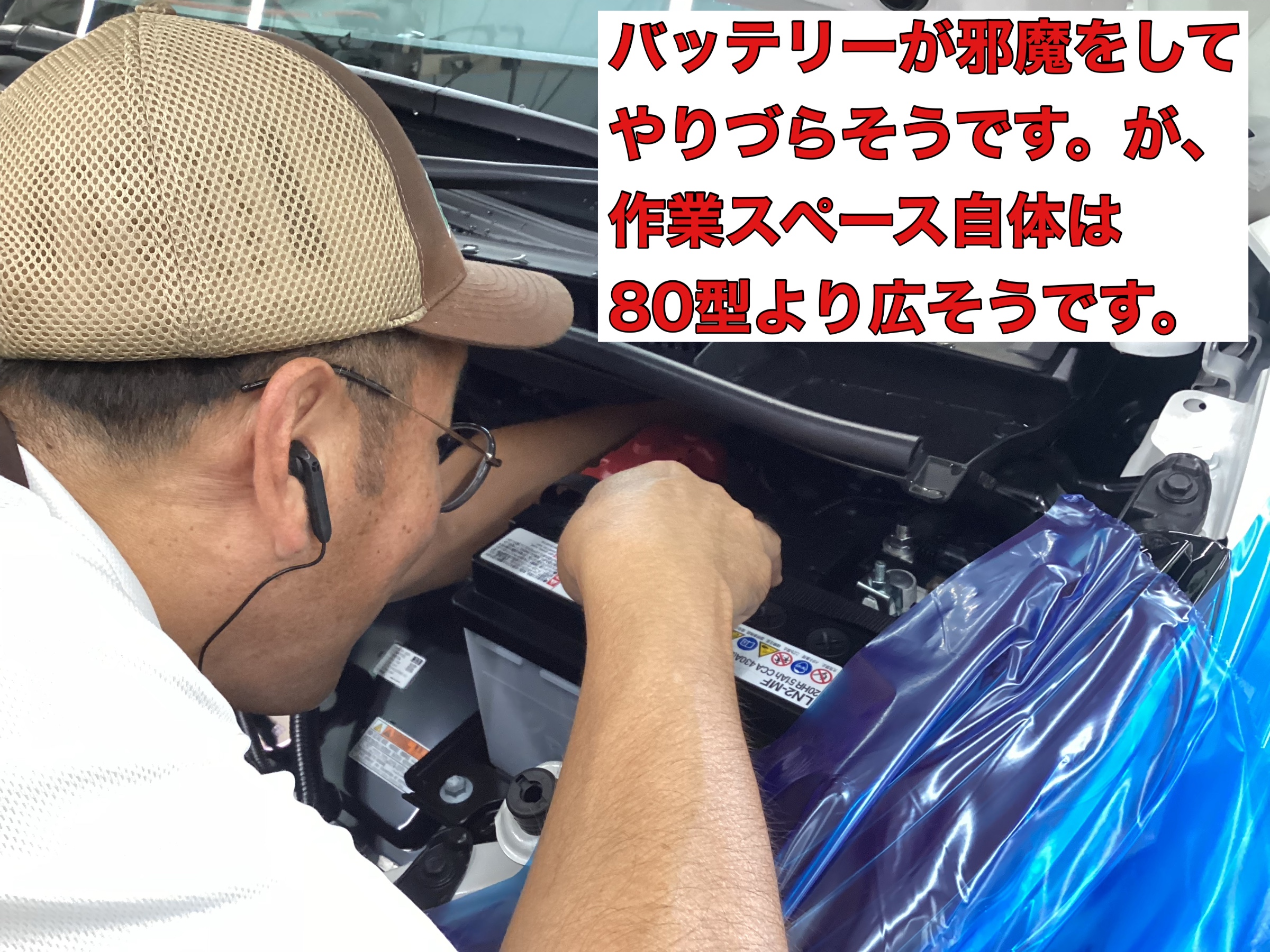 バッテリーが助手席側に鎮座しており、鬼澤スタッフはやりづらそうでした…