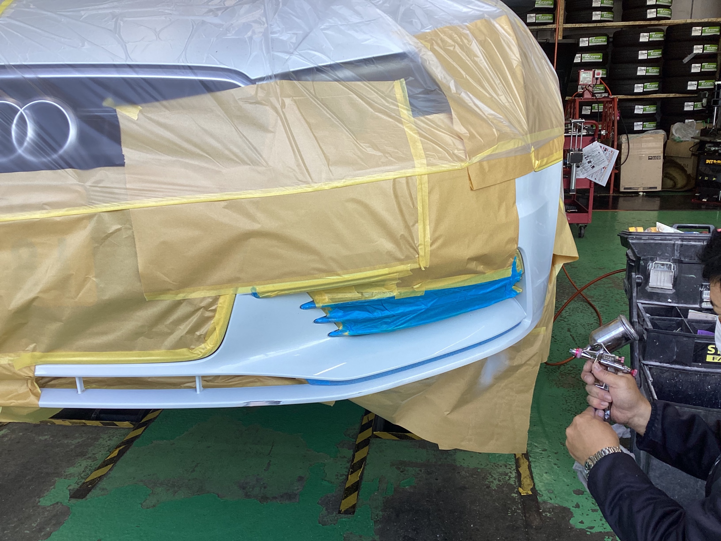 しっかりと車体にマスキングをした後、塗装の作業に入っていきます。