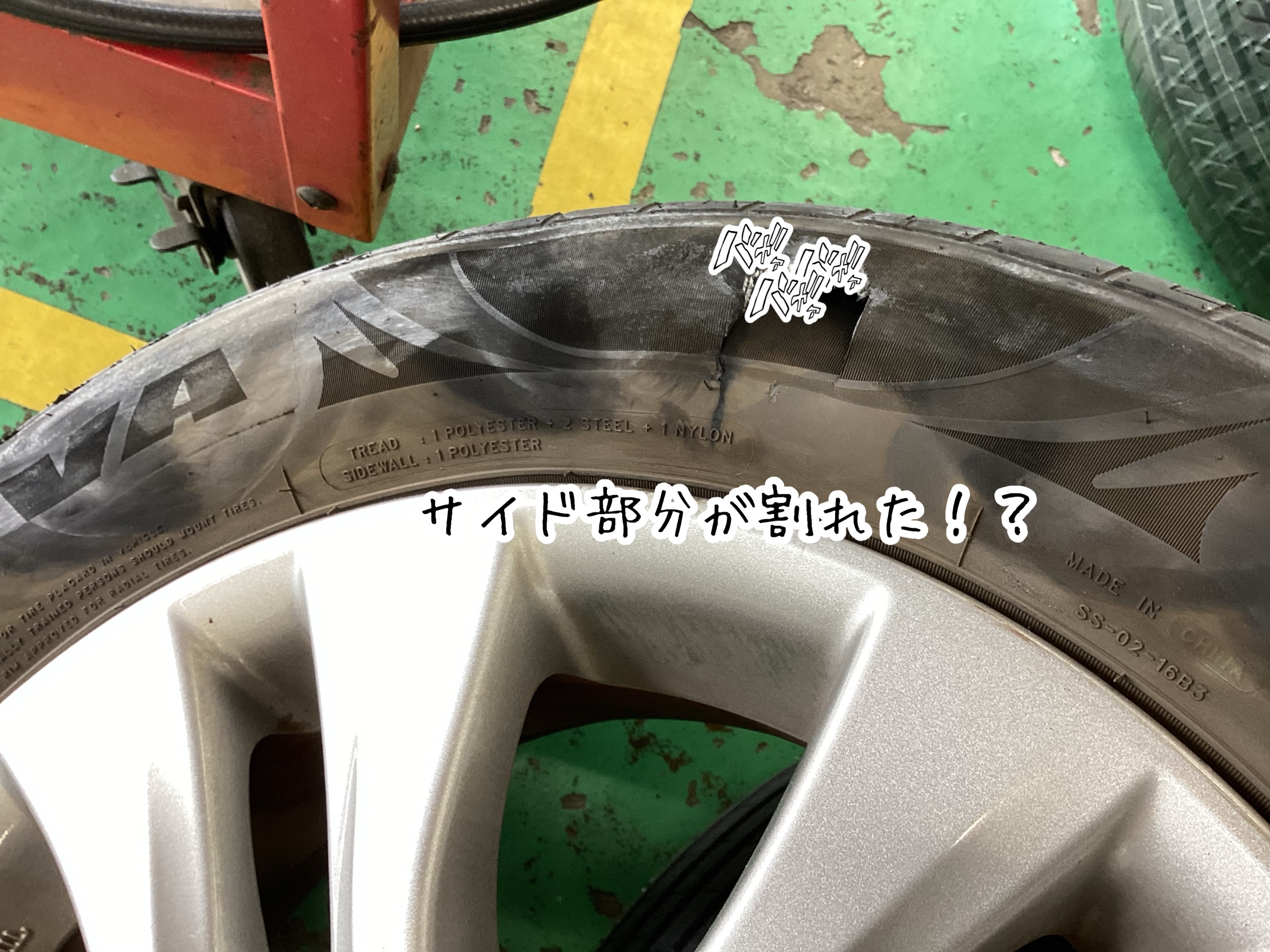 タイヤのサイド面が割れてしまい走行不能