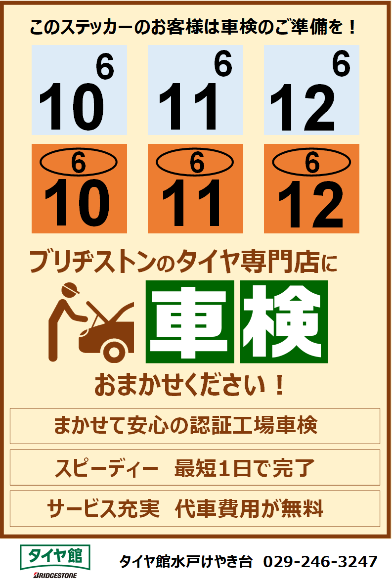 タグ:タイヤ館 水戸 けやき台 タイヤ 安い 車検 無料 見積り 見積 オイル交換 バッテリー交換 エアコンフィルター交換 ワイパー交換 メンテナンスパック お得 無料点検 無料見積り エンジンオイル エアコンフィルター バッテリー ワイパー 代車 無料 クーラント ブレーキパッド ブレーキ メンテナンス