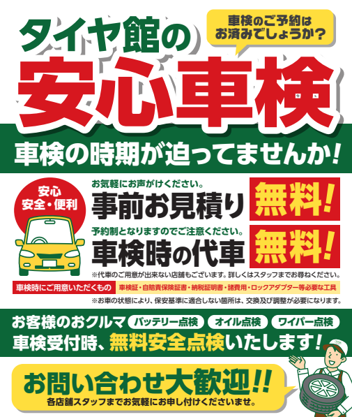 タイヤ館は車検も行っています!是非お問い合わせください!