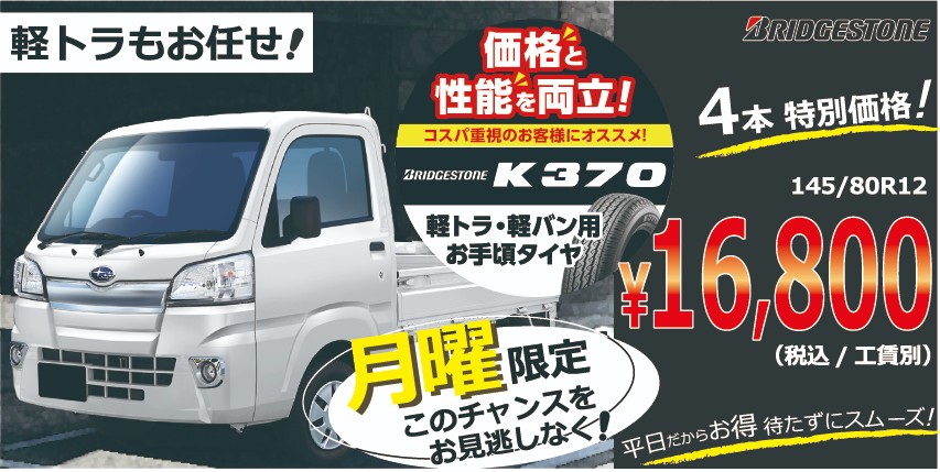 軽トラオーナー様へお得なご案内 ポスト 2026年4月13日 軽トラユーザー様へ ブリヂストン製のタイヤを特別価格で提供いたします。 「月曜」だけの限定価格! ■145/80R12 4本セット特別価格:16,800円(税込/工賃別) より安心・快適にお使いいただけるよう、この機会にタイヤ交換しませんか? 是非ご来店ください。お待ちしております。 カテゴリ:タイヤ関連 お知らせ 商品情報