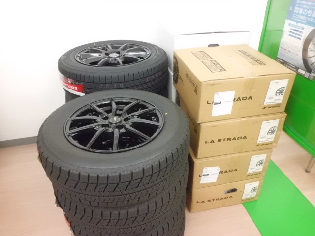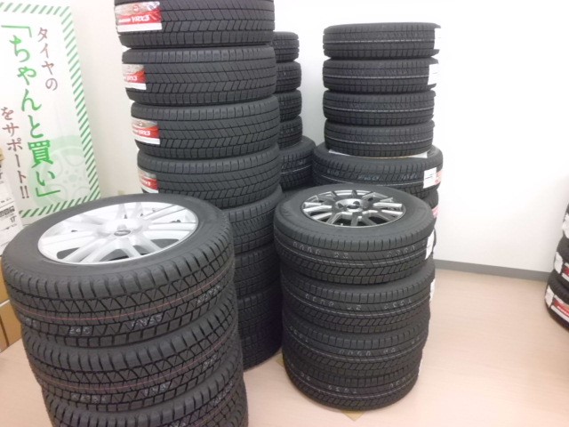 お買い上げいただいたスタッドレスタイヤの山が着々と積みあがっておりますが、
