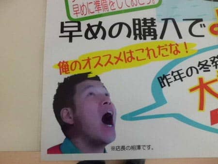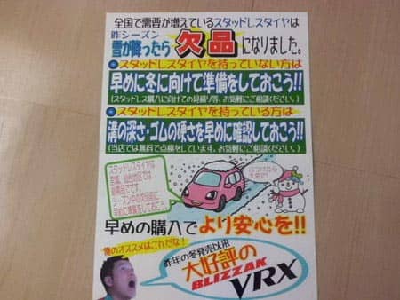 店長が吠えています? ポスト 2014年8月22日 今回、スタッドレスタイヤのPOPを作ってみました。下の方には店長の相澤が吠えて?います。近年、関東方面でも大雪が降る為全国でスタッドレスが品薄になる恐れがあります。早めの準備をおすすめします。このPOPをみて自分のスタッドレスタイヤが大丈夫かどうか不安な方はタイヤを持ってご来店ください。無料で溝の深さ、ゴムの硬さの点検をしています。