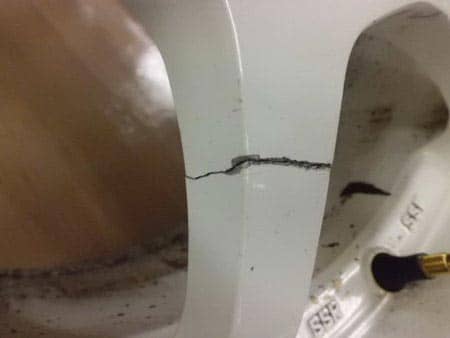 予選1回目が終わったホイールの増し締めをしていていつの間にキズ付いたんだと思ったらなんと真っ二つに割れていました。