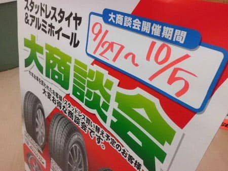 本日より、スタッドレス大商談会を開催いたします。 ポスト 2014年9月27日 いつもWEBをご覧いただきありがとうございます。本日より、タイヤ館いずみ「スタッドレス大商談会」を開催いたします。10月5日(日)までの1週間、今年度”一発目のスタッドレスタイヤの売り出し”となりますので、ぜひともご来店お待ちしております。 スタッフ一同