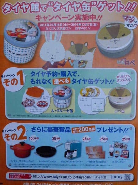 今日からキャンペーン実施です。 ポスト 2014年10月18日 タイヤ館で“タイヤ缶”ゲット!!キャンペーンが始まりました。タイヤの予約・購入でタイヤ缶がゲットできます。タイヤ缶ゲットで、さらに抽選で豪華商品が当たるかも…!!期間は10/18~12/7までです。タイヤ缶が無くなり次第キャンペーンが終了となりますのでスタッドレスタイヤが今シーズン必要の方はぜひ、早めにご来店ください。お待ちしています。