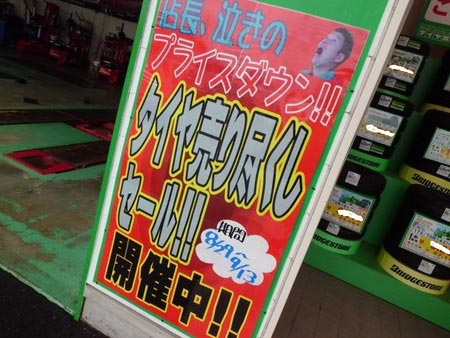 マル得イベント開催中‼ ポスト 2015年8月29日 今日も雨降りですが(-_-;)こんにちは、相澤です。雨なんか、私の涙に比べれば・・・・。とっ言う事で、ただ今8月29日(土)から9月13日(日)まで、マル得“タイヤ処分セール”を開催しております。私泣いております(ToT)/~~~でもお客様が喜んでいただければ私の涙も必ず喜びに変わるはず!そうです。お客様の喜びが、私の喜びなんです!!限定品、スタッドレスタイヤのお買い得品もありますので、是非ご利用下さい。