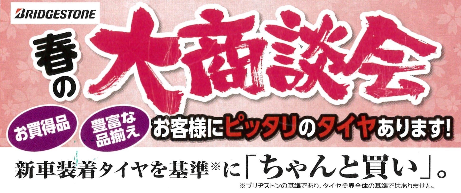 本日より、春の大商談会開催いたします。 ポスト 2019年3月8日 春の訪れが早くなりそうな天気が続きますが、もう夏タイヤの準備は? 本日より春の大商談会を開催しております。 8(金)・9(土)・10(日)・11(月)の4日間! お買い上げ景品もご準備してお待ちしております。 カテゴリ:お知らせ