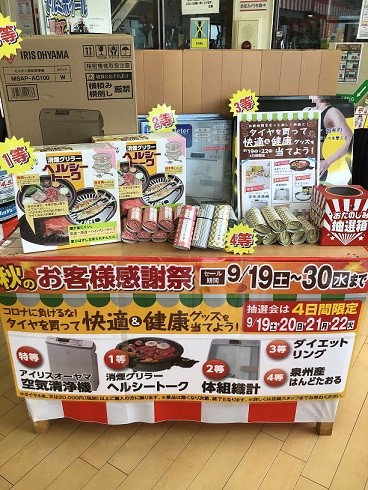 9/19(土)~9/22(火祝)までの期間にタイヤ4本 または 2万円以上お買い上げ