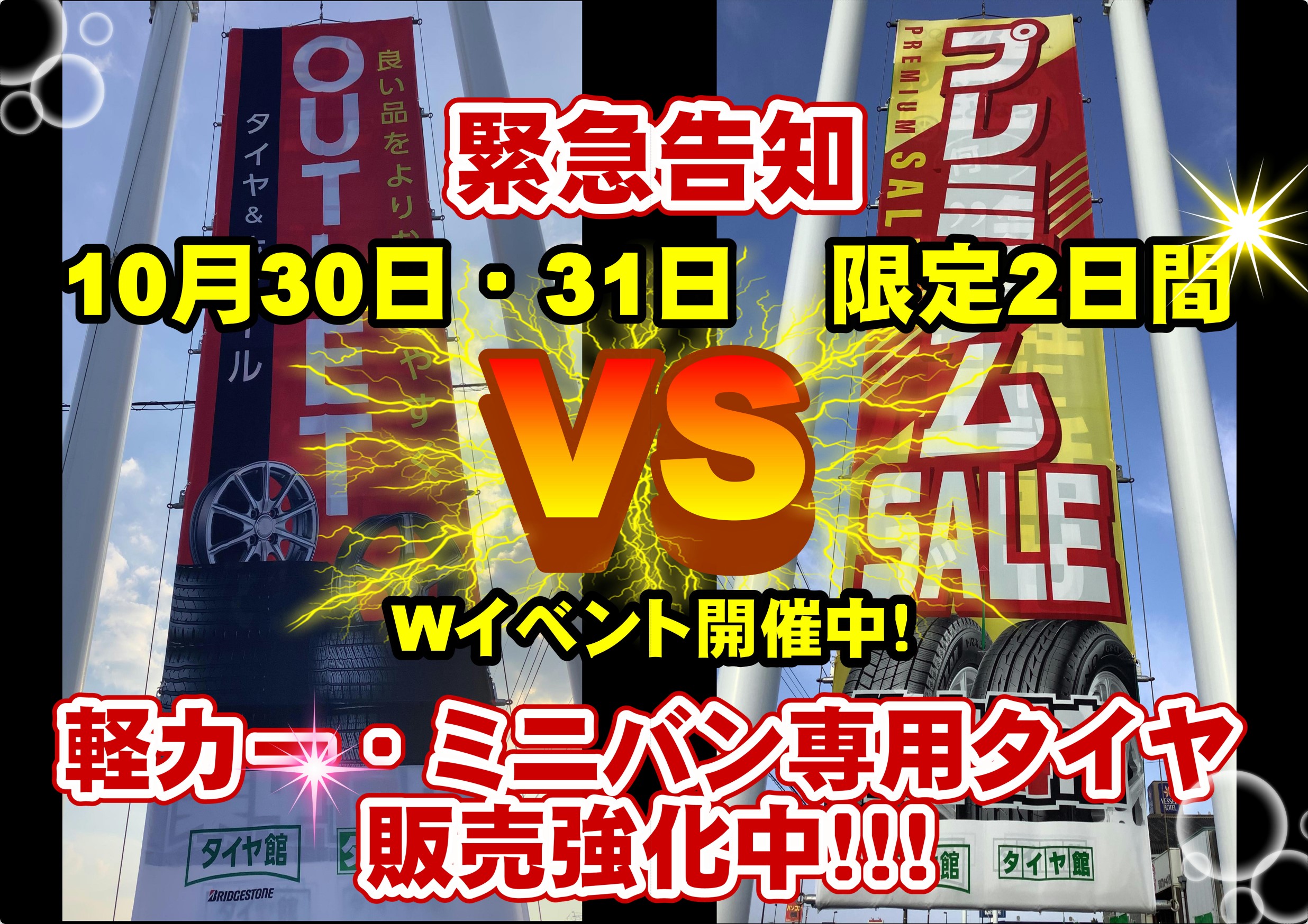 緊急告知!Wイベント開催!! ポスト 2021年10月30日 10月最後の週末。 Wイベント開催します! プレミアムセールが10/31までなので、2日間イベントが重なります(^^♪ なので~タイヤがお得にご購入できます! 軽カータイヤ コンパクトカータイヤ ミニバンタイヤ セダンタイヤ SUVタイヤ タイヤをお探しのお客様は、気軽にお電話下さいm(__)m 担当:副長