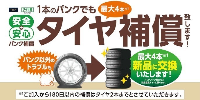 新品タイヤ4本交換の際は、ご一緒に安全・安全「パンク補償」の加入をおススメします!