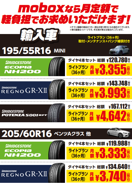 【mobox】『輸入車にお乗りの方にオススメ!』タイヤも定額で経済的に買えちゃう!