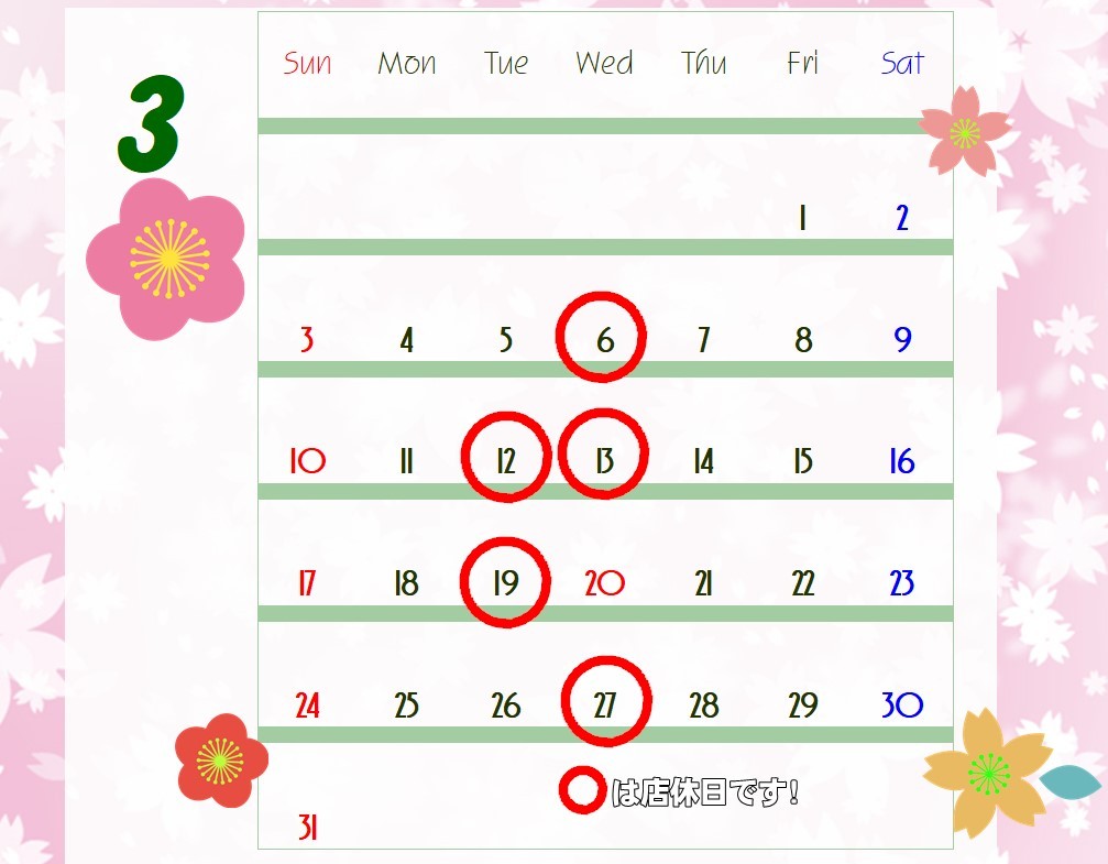 6日(水) 12日(火) 13日(水) 19日(火) 27日(水)が店休日になります!