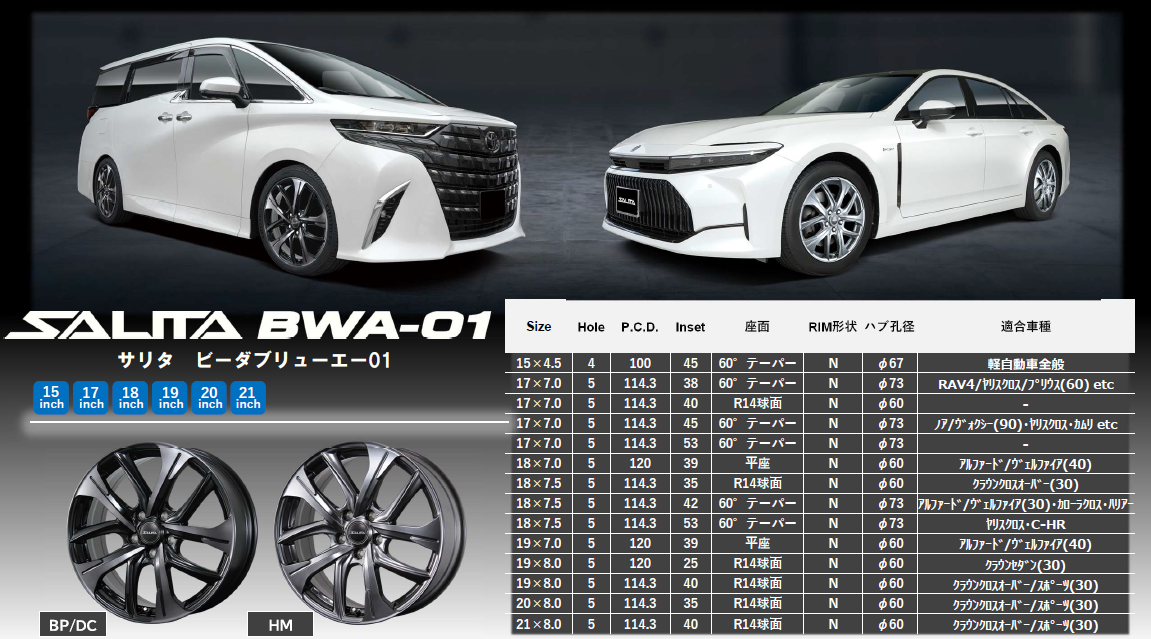 新発売 LEXUS/TOYOTA専用マッチング タイヤ館専売モデル SALITA BWA-01 ポスト 2026年4月29日 新発売 LEXUS/TOYOTA専用マッチング タイヤ館専売モデル SALITA BWA-01 厳しい品質基準を上回るべく、満を持して発売されました。 タイヤ館専売モデル SALITA BWA-01 LEXUS/TOYOTA専用 (※軽自動車サイズあり) 車検対応マッチング・ブラックポリッシュ・ダーククリアの2カラー タイヤ館 都城 住所:885-0006宮崎県都城市吉尾町6120-1 電話番号: 0986-38-7688